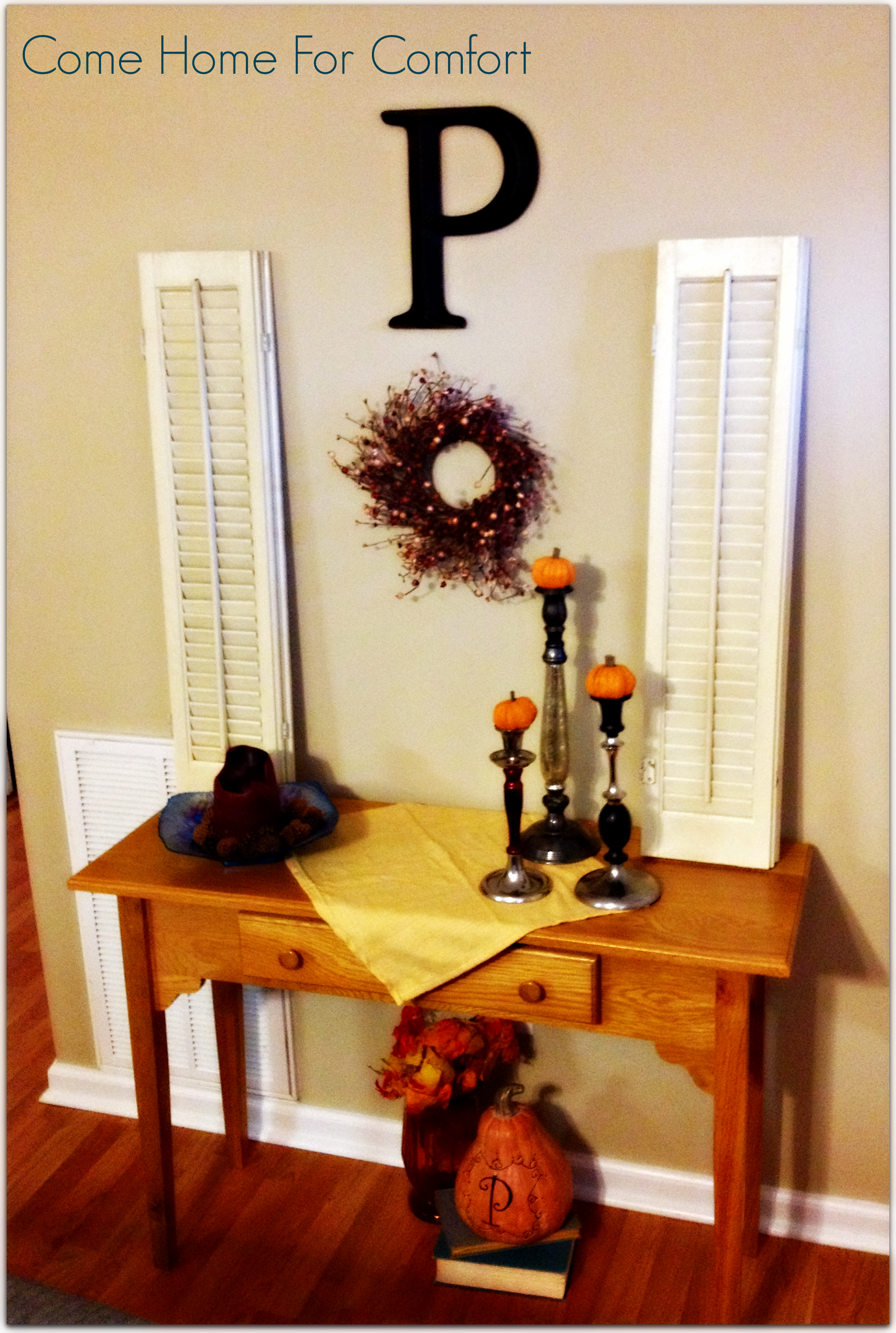 Happy Thursday, lovelies! It’s supposed to be in the 80’s here again today, but I’m ignoring the heat and welcoming the comforts of fall into my home. Since I invested time and money into decorating my front door, I needed to decorate the space right inside the front door. I’ve inherited some nice pieces of furniture built by my grandfather, and one of them sits in my entryway. It just needed a little fall inspiration. Here it is!
