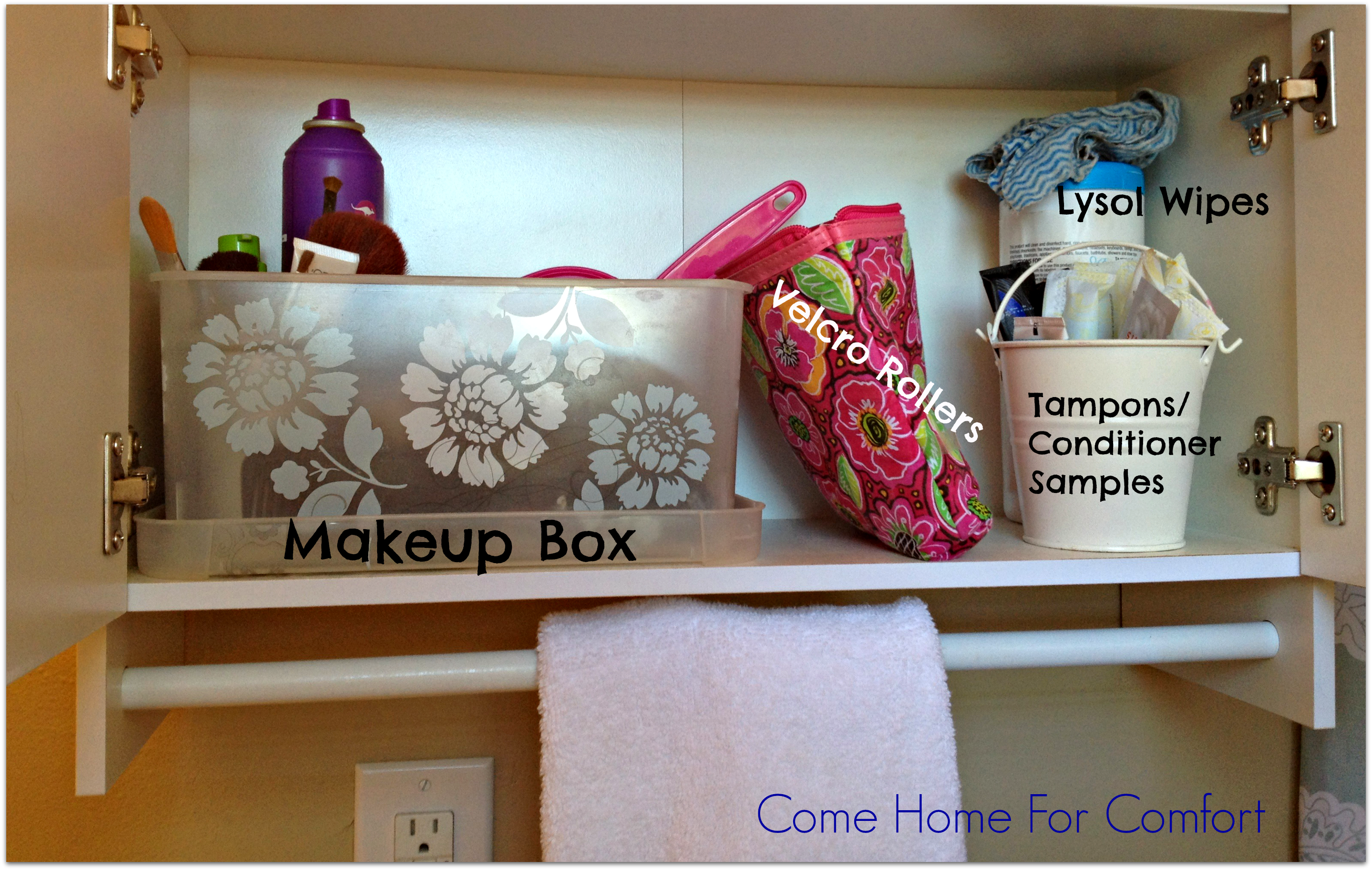 Here’s the storage cabinet we installed over the toilet. There’s an open shelf over the cabinet that you can’t see in this picture. I keep a few bath and hand towels up there. For me, the key to keeping storage areas in order is having plenty of container options. Can you imagine what a horrible mess this would be if all my makeup, rollers and hair care products were loose inside the cabinet?