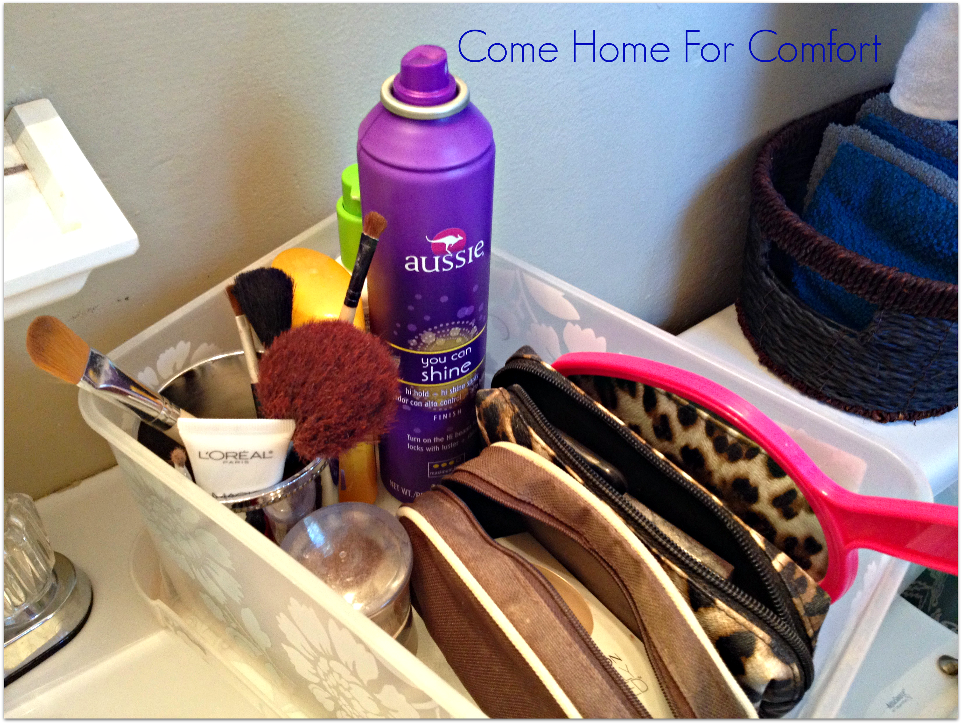 Happy Monday, lovely readers! We’ve lived in our house for almost a year, and I am so thankful for it! No house is perfect, and the master bathroom at my house is clearly not the product of a woman’s design. It’s teeny tiny, so a pedestal sink was installed when our house was remodeled a few years ago. It’s pretty to look at, but there’s no room for storage and no place to set my stuff when I’m getting ready! My curling iron even has a hard time balancing on the rim! I found a plastic box on the TJ Maxx clearance aisle, and balancing it on the rim of the sink is the only thing that has worked for me.