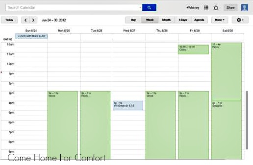 Set up a shared calendar that you both can access and edit. We share a Google Calendar associated with our email addresses. It’s helpful for me to see what Paul’s schedule will be, just for the comfort of knowing where he is. I add things like family holidays, birthdays, even church events and send him an invitation. It helps us stay connected when we aren’t able to discuss our plans over a candle light meal. 🙂 This calendar format also helps me to see the “blocks” of time we have together!