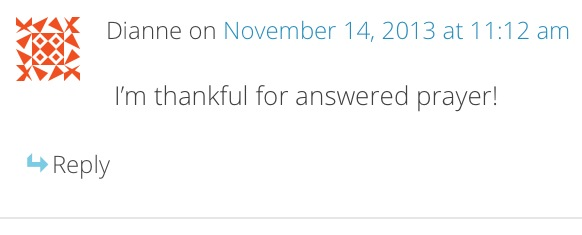 I enjoyed reading all of your “thankful” entries in the Holiday Hostess Gift Giveaway! One of the best things we can do in an situation or circumstance is to count our blessings. God is so good to us, and has given us all things richly to enjoy. Hearing what others are grateful for often causes me to realize things I take for granted, like the privilege of having my husband home for Christmas every year instead of praying for his safety while serving in Afghanistan. That in turn makes me grateful for the brave families who make that sacrifice for me!