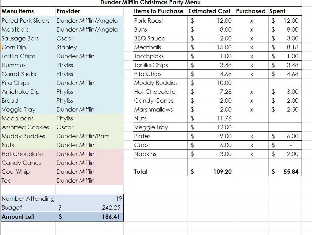 I’m also on the Party Planning Committee for my office party. We are serving hors d’oeuvres in a pot-luck fashion. With so many people bringing food AND a definite budget that must be adhered to, I had to keep this party organized. Here’s my spreadsheet for the office party (my office is quite often similar to the Scranton branch of The Office, so the names changed here are to protect the guilty!).