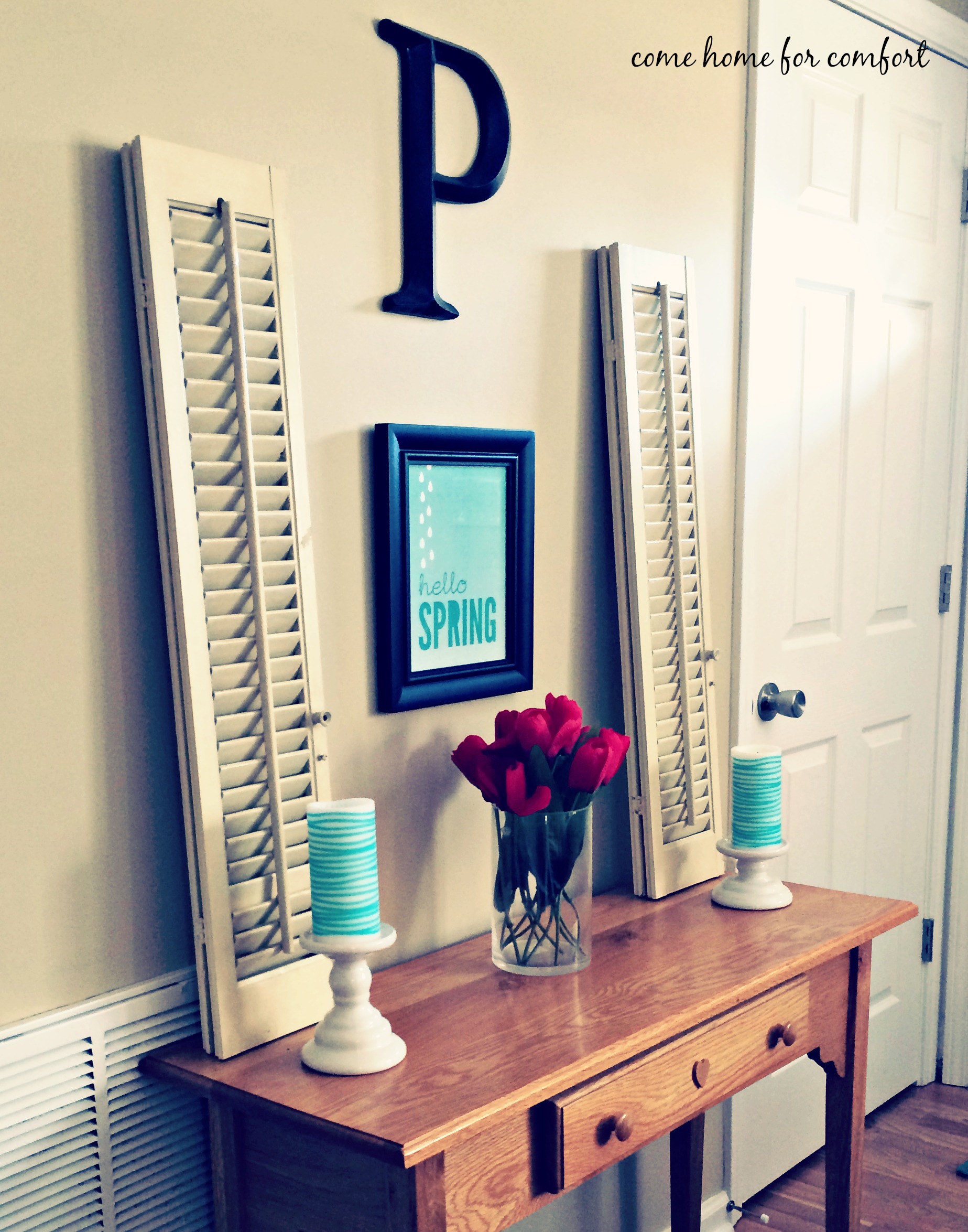 I like to keep the colors in my seasonal decor consistent with the color scheme already established in that room. My mom always started her spring decor with a vase of pastel tulips that matched her living room, and I thought I’d do the same with my red tulips. I hope to keep these things out until the end of April, so I kept the decorations clean and simple.