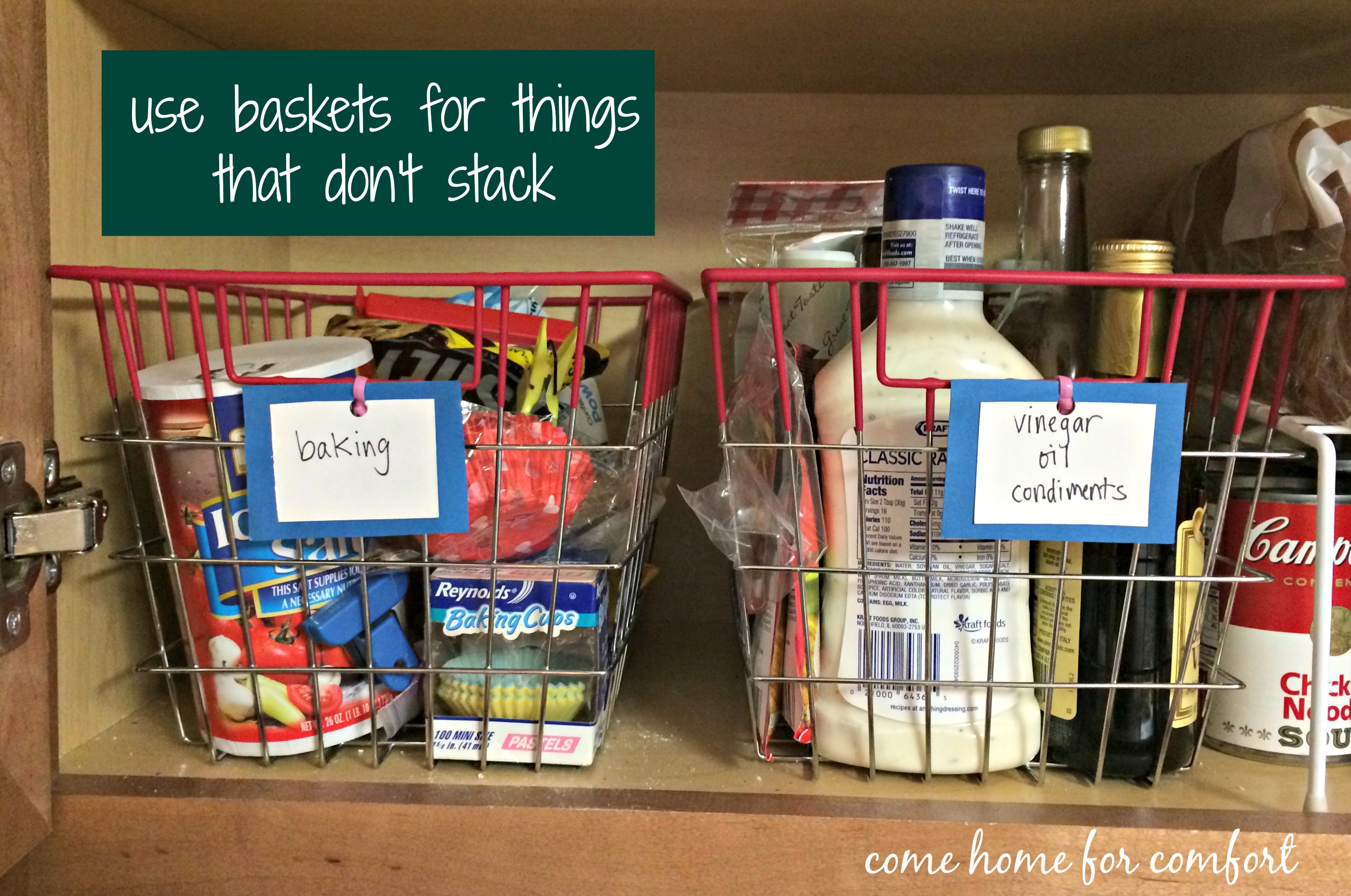 - Store like things together in bins (for example, my baking bin sits on the counter when I’m baking. It holds most all of the dry ingredients I need!)
