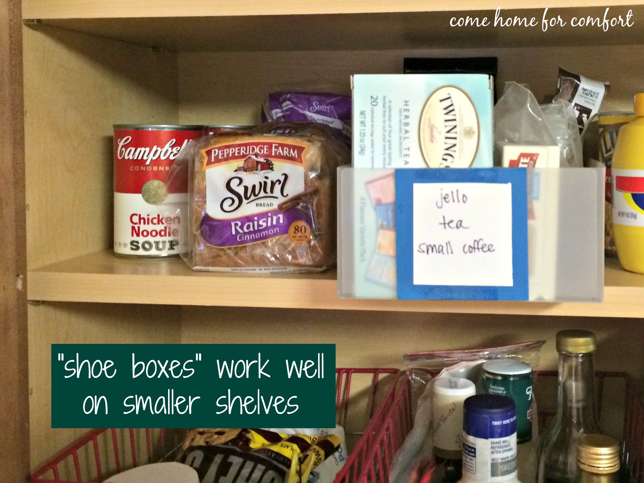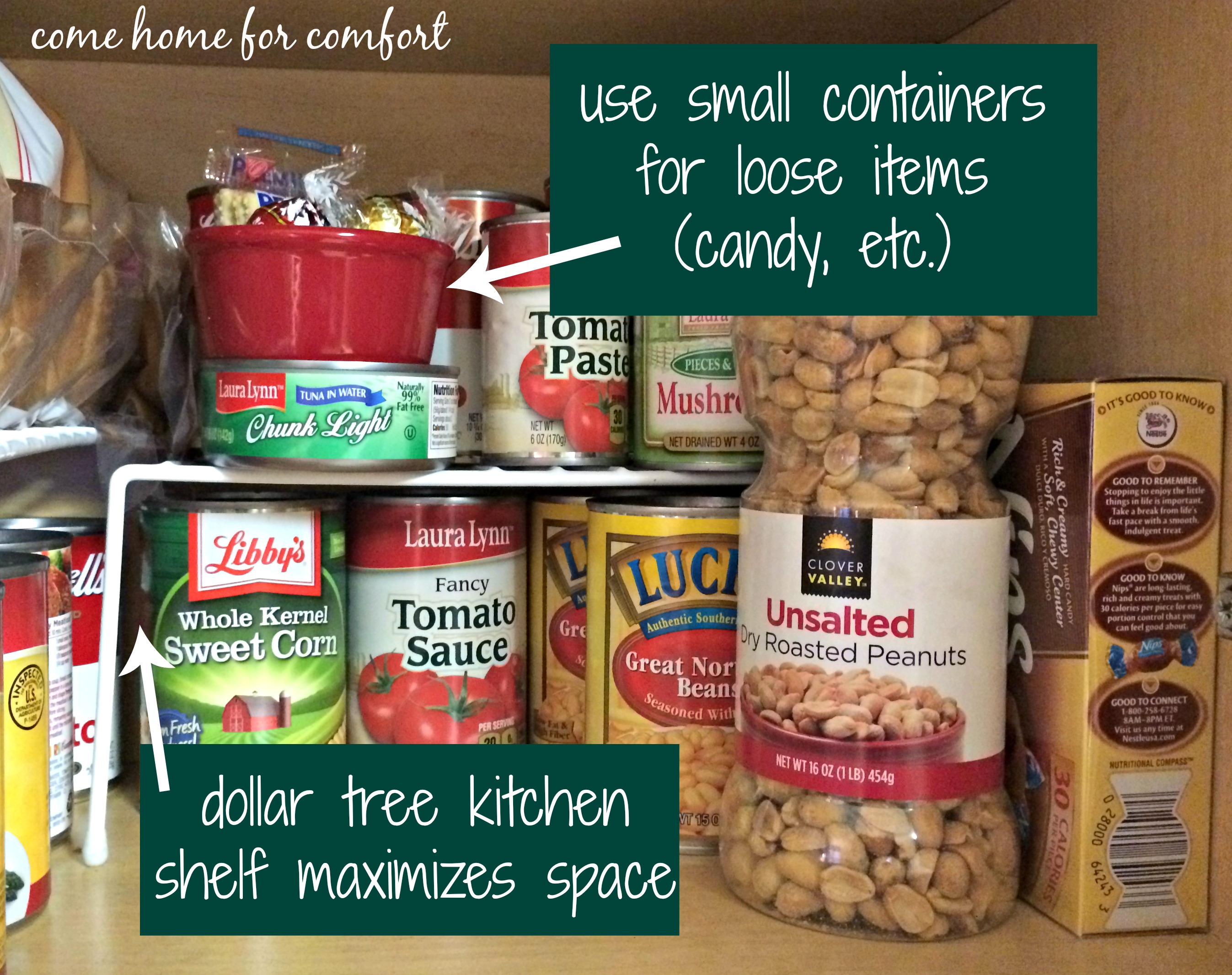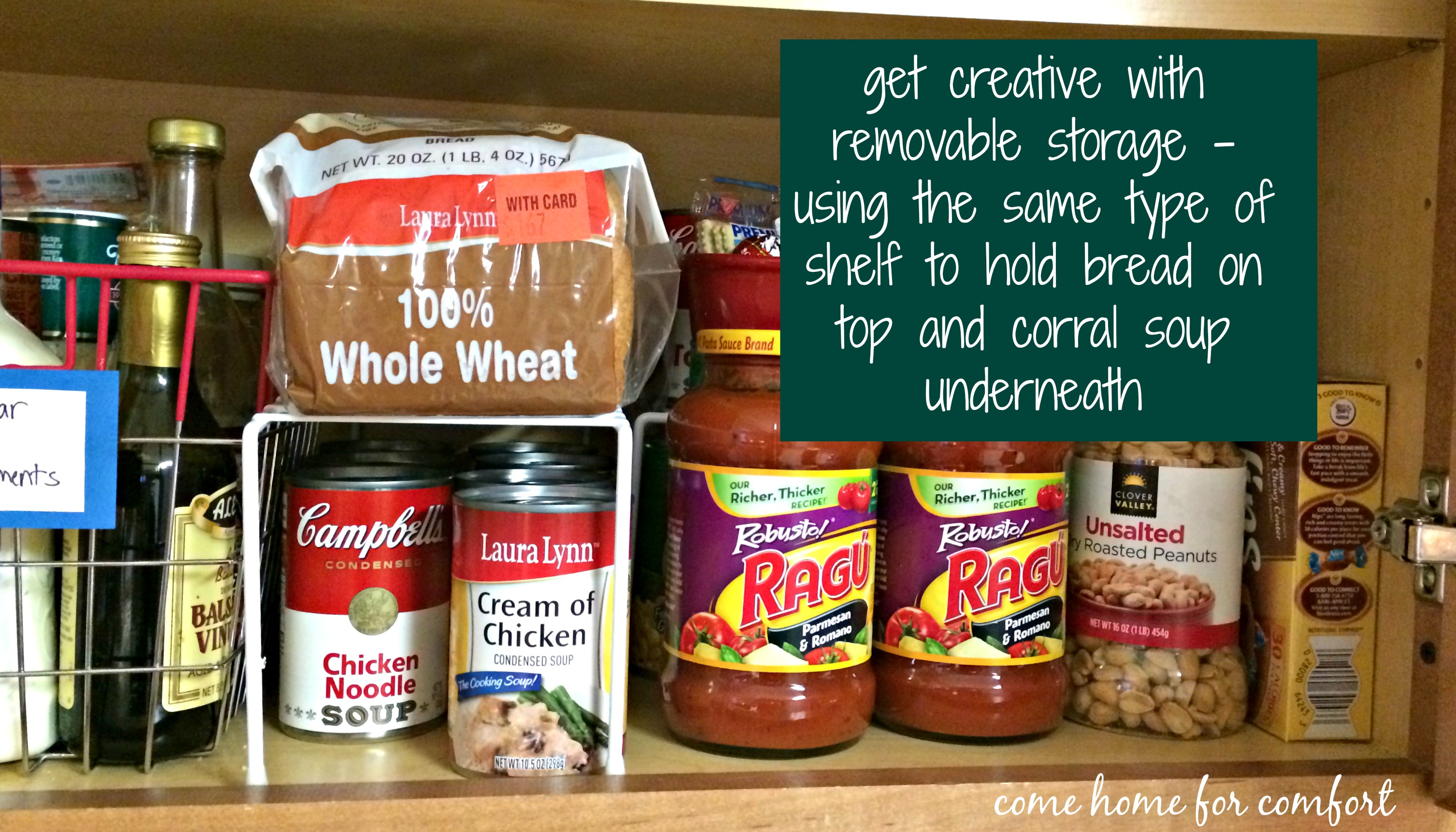 - If you stock up on sale items, use the top shelves for overflow (for example, I store a few cans of soup on the bottom shelf and store the rest in the hard to reach corner of the middle shelf)