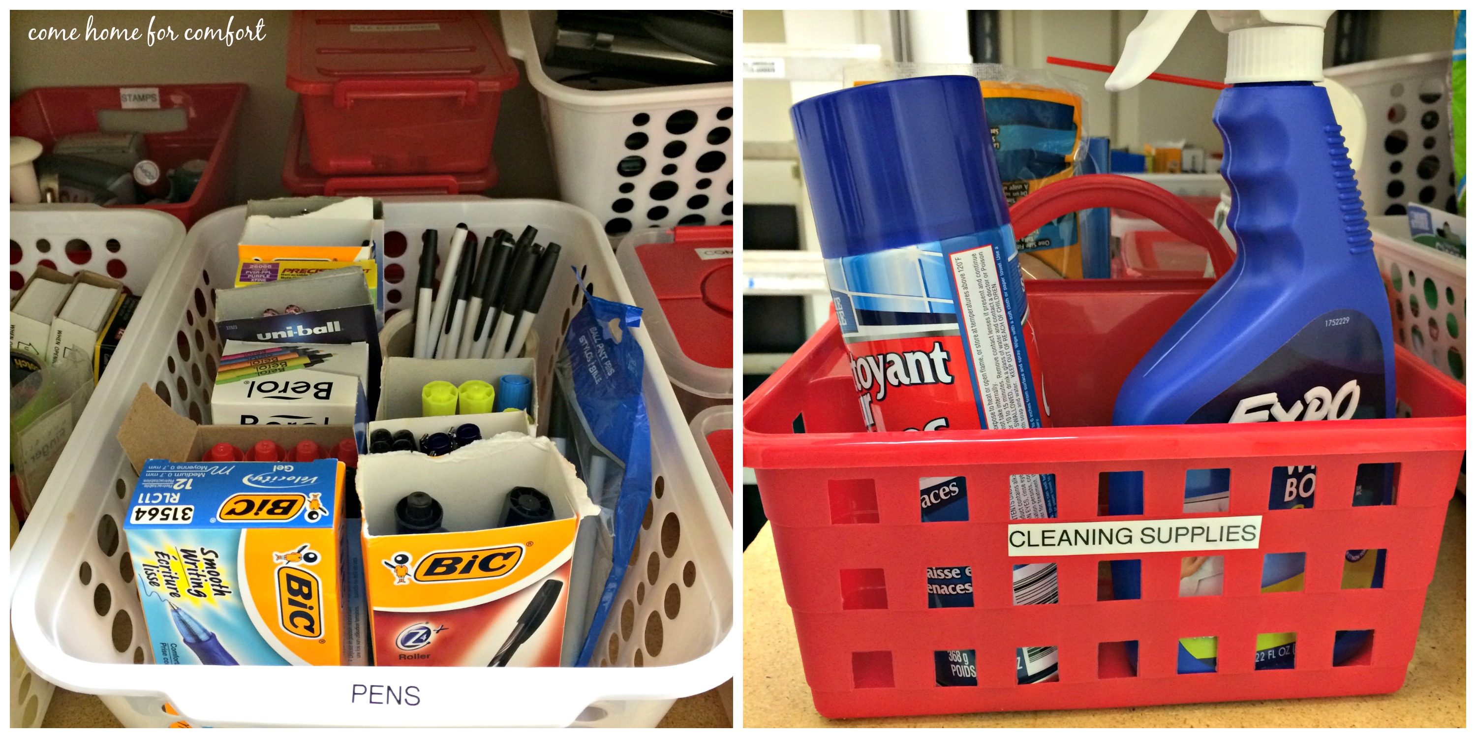 I went to the Dollar Tree and picked up 13 assorted containers (in the same color, for continuity). They have some really great storage options from open bins to containers with locking lids. I polled my co-workers and made sure the most frequently accessed items were close to the front of the shelves. Things used less frequently went in the back or on the bottom shelves. Each bin was then given a clearly visible label.