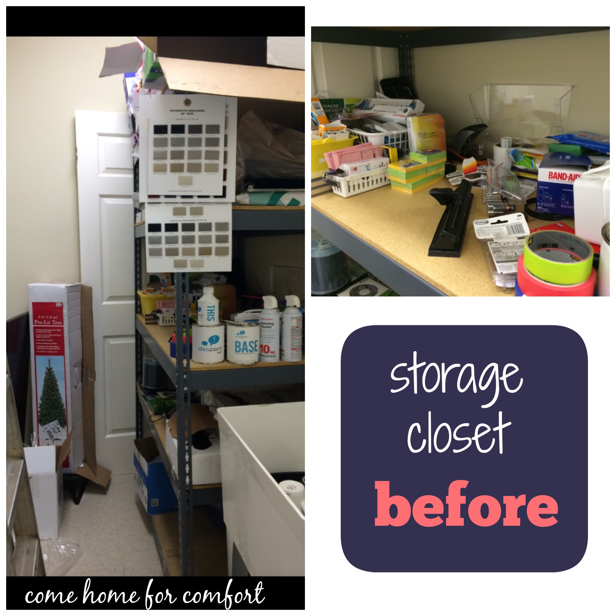Here’s the small storage closet in the office where I work. It has been in use for less than a year, yet it is quite the disaster of an area! As I worked to organize the closet, I became discouraged that the area wasn’t looking that great – until I looked at my “before” pictures and realized how far I’d come!