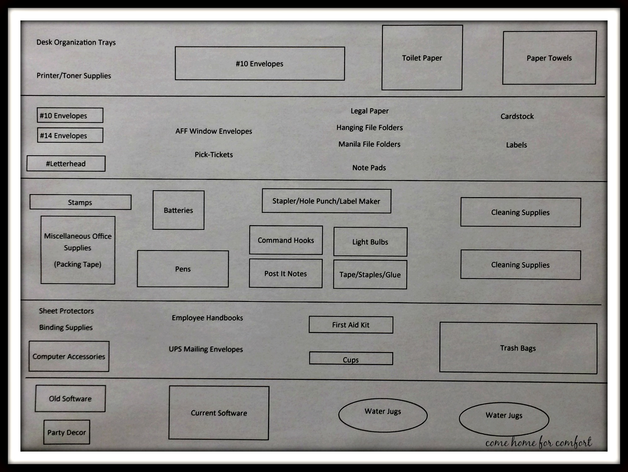 I created a diagram that lives on the wall next to the storage shelf, outlining the basic items on the shelf. I think this would also work well in your garage or basement utility room. If everyone who has access to the area knows where things should go, it will help you with tip #5…