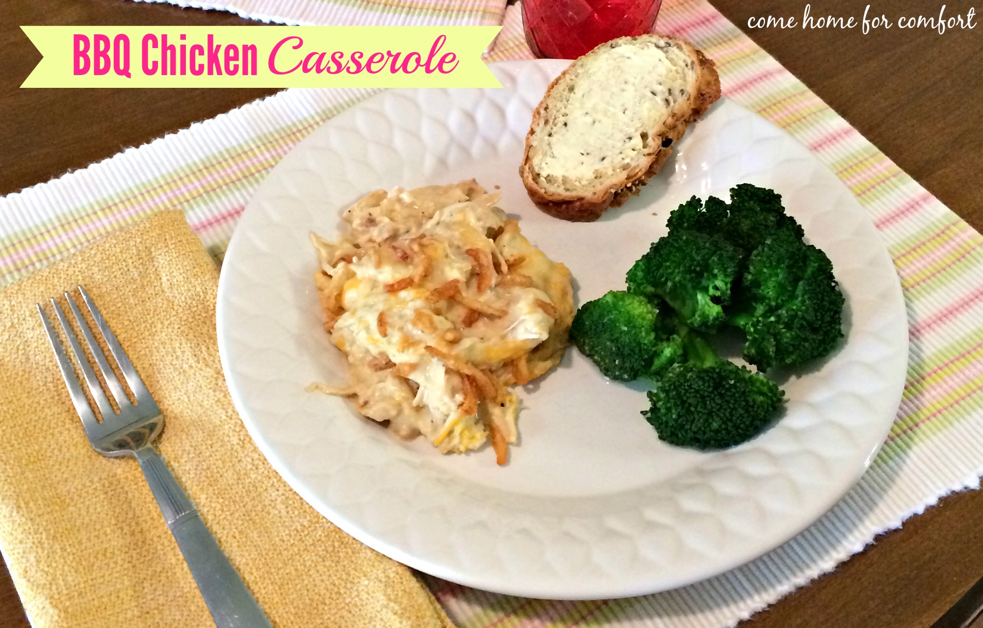 I’ve mentioned what I fan I am of the “Cook once, eat twice” method. It’s such a time and money saver! Last week I used boneless, skinless chicken breasts to make BBQ chicken in the crockpot. We ate half of the meat at supper, and I chopped up the rest for another meal. I came up with this casserole recipe using things I had on hand. Served along with some steamed broccoli and a slice of toasted 5-grain bread, it was a lovely and simple supper!