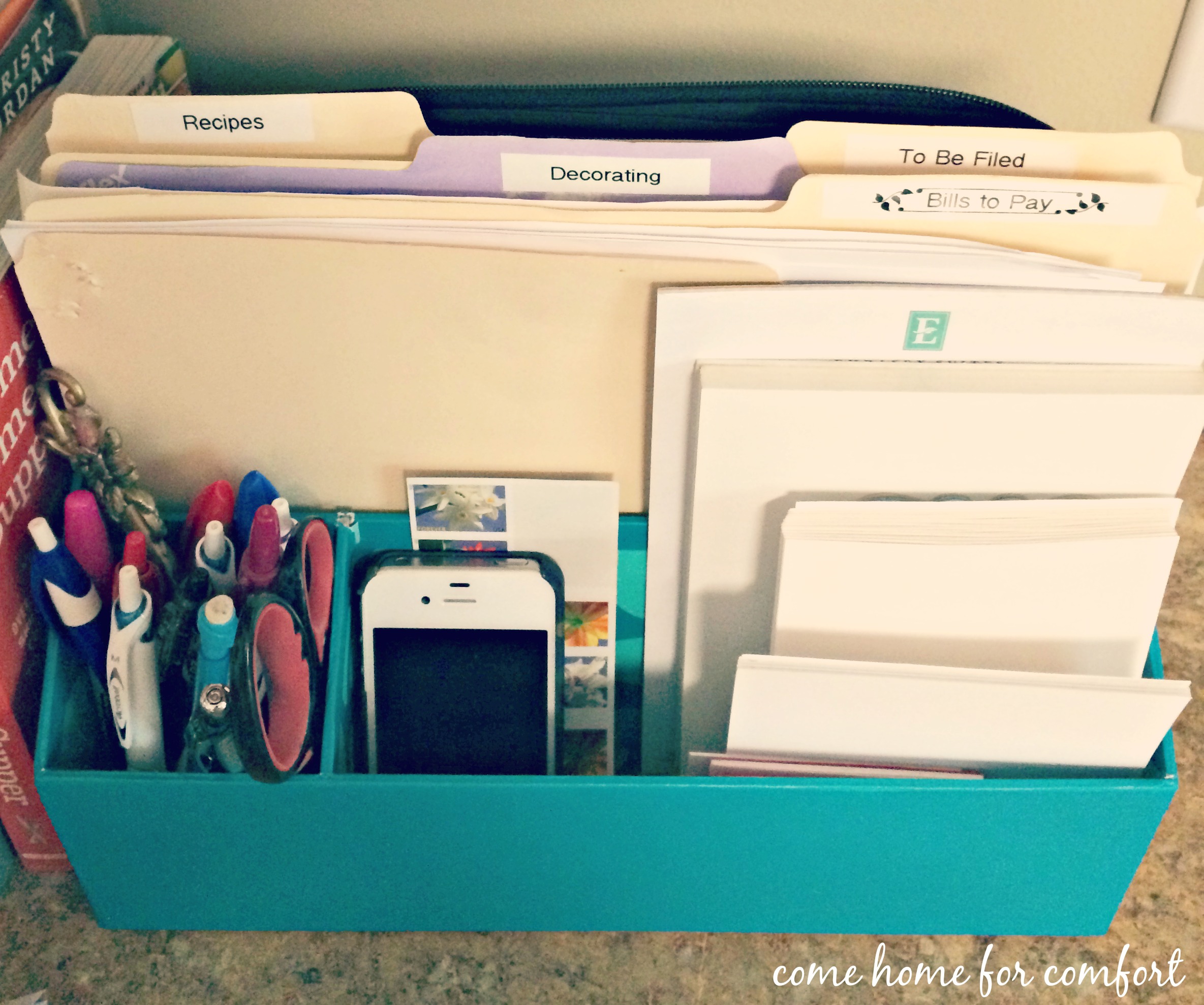 I also store my coupon binder and my two favorite cookbooks next to my organizer, for easy access. My mini kitchen office is extremely helpful in winning the paperwork war!