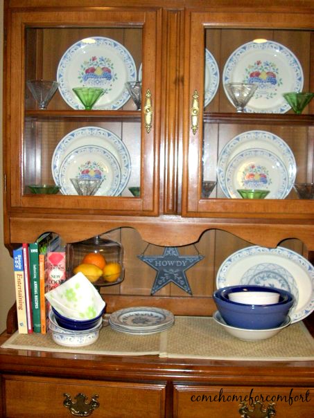 I live in a townhouse. It is spacious but built like the shotgun houses of years gone by. When we moved in I knew I had to stop the eyes of my guests from going straight to the back door. I found a pretty black hutch on sale at Hobby Lobby and placed it strategically in my kitchen. Much like your hutch, it houses pretty dishes and makes me happy whenever I look at it.
