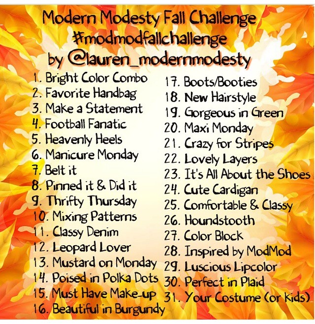 4. I’m excited to participate in Modern Modesty’s Fall Challenge on Instagram! I’ve never committed to one of these before, but I think it will be great inspiration for each day’s outfit! It starts October first – if you want to participate, just use the hashtag #modmodfallchallenge.