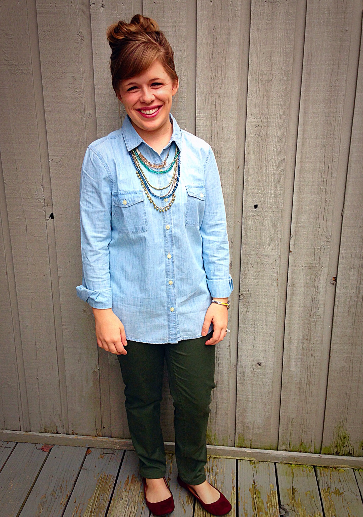 GREAT outfit!! I have a few chambray shirts and I love them. I need to try to button it up and wear it with a statement necklace since that isn’t something I’ve tried. I also love those green pants – so flattering and great color!! Looking forward to your fashion posts 🙂