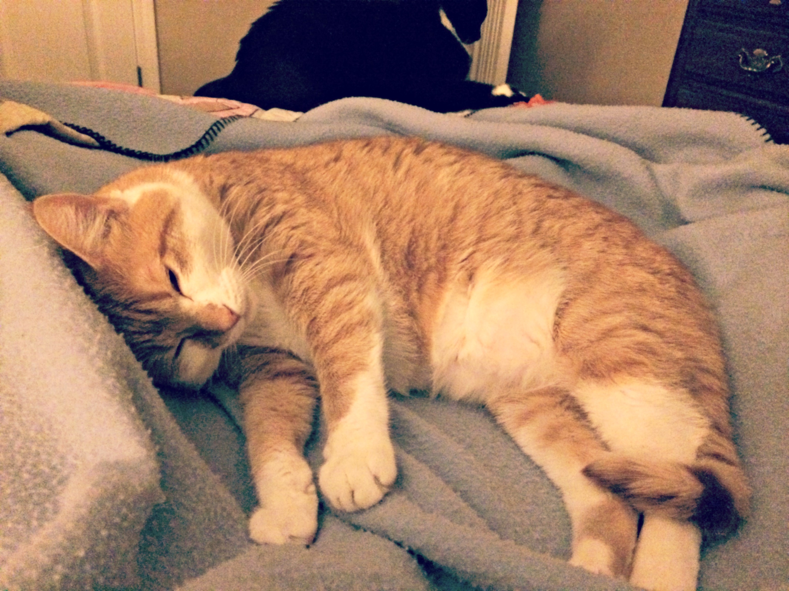 4. Speaking of the kitties…this picture accurately depicts their personalities. Peggy is snoozing while Thelma Lou attacks something in the background.