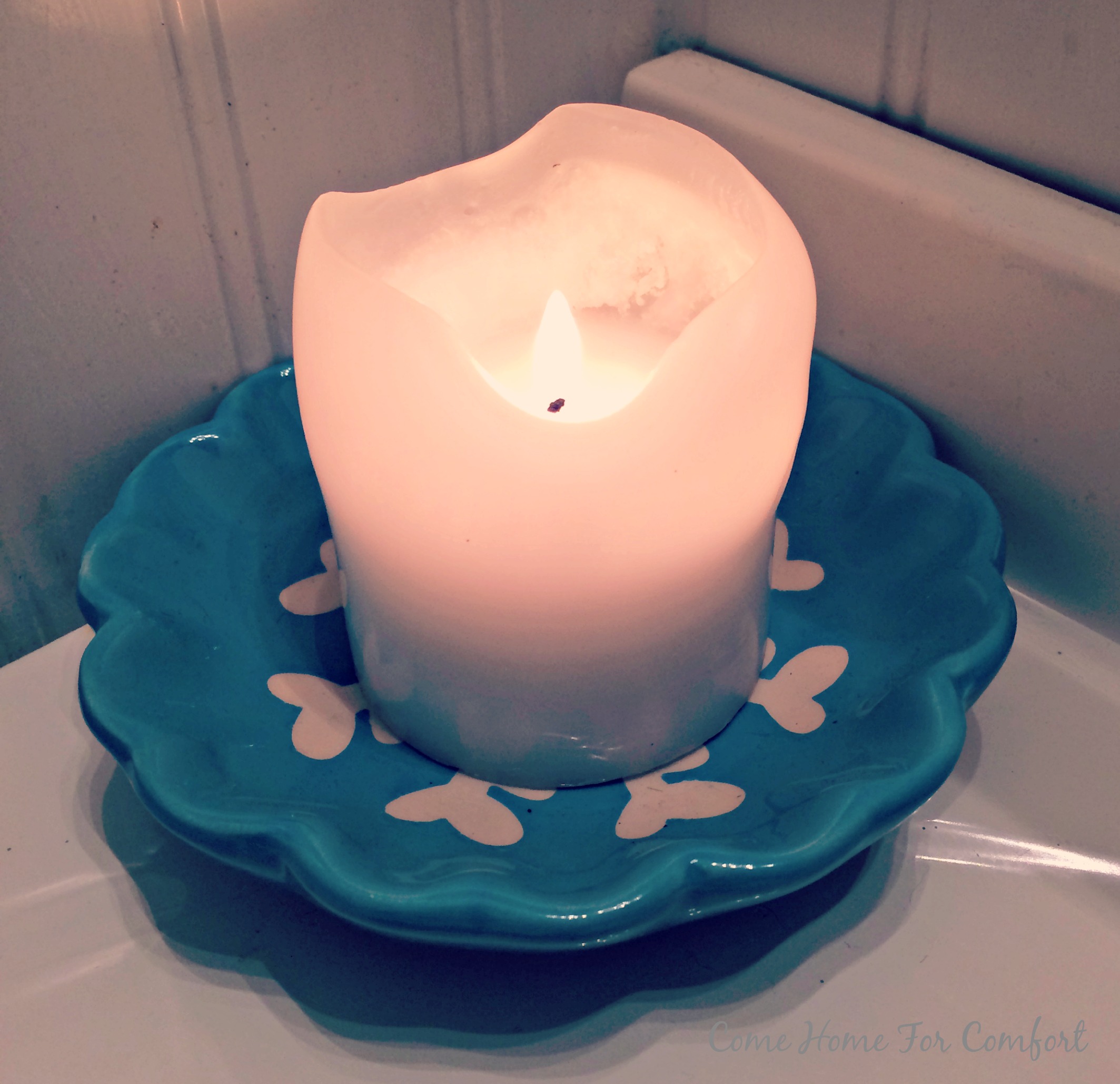 I put a new print in the picture frame and added a snowflake candle dish. Using colors that coordinate with the room’s decor keeps the seasonal touches light and tasteful.