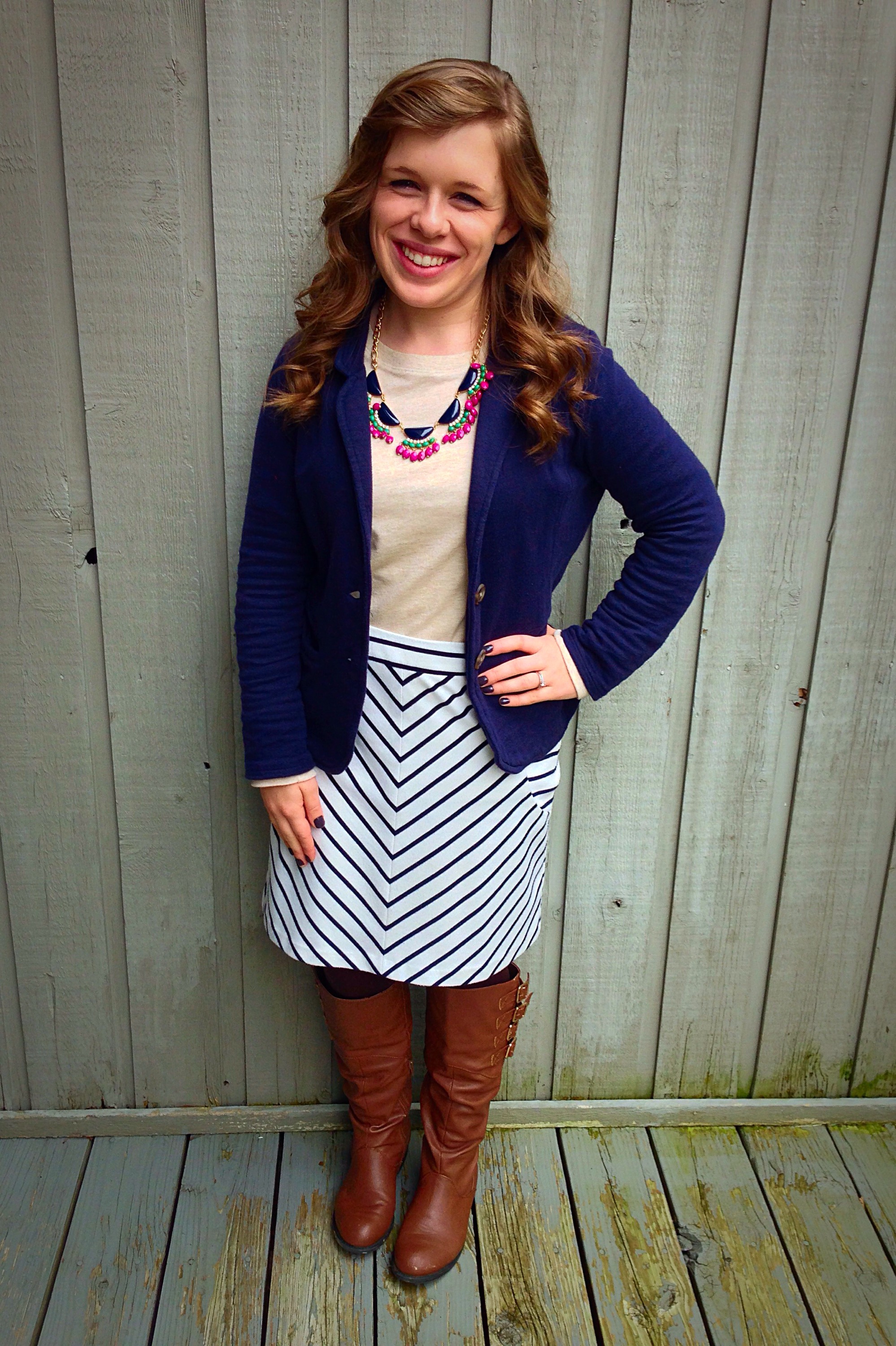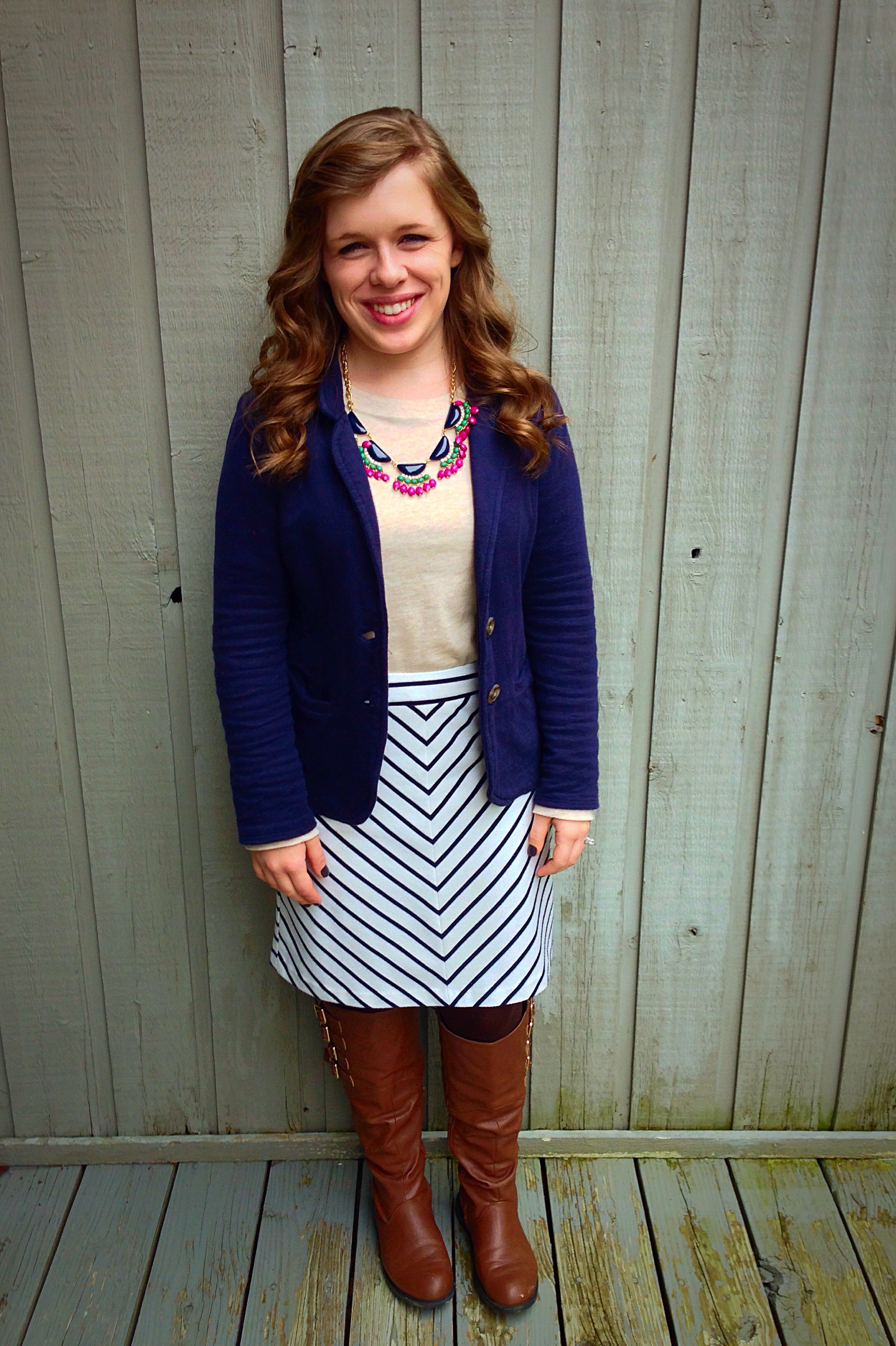 My outfit shown below is comprised completely of neutrals (white, navy, and tan/brown). By itself it’s a pretty plain Jane outfit, but with the addition of a colorful and sparkly statement necklace, my outfit gained some personality.