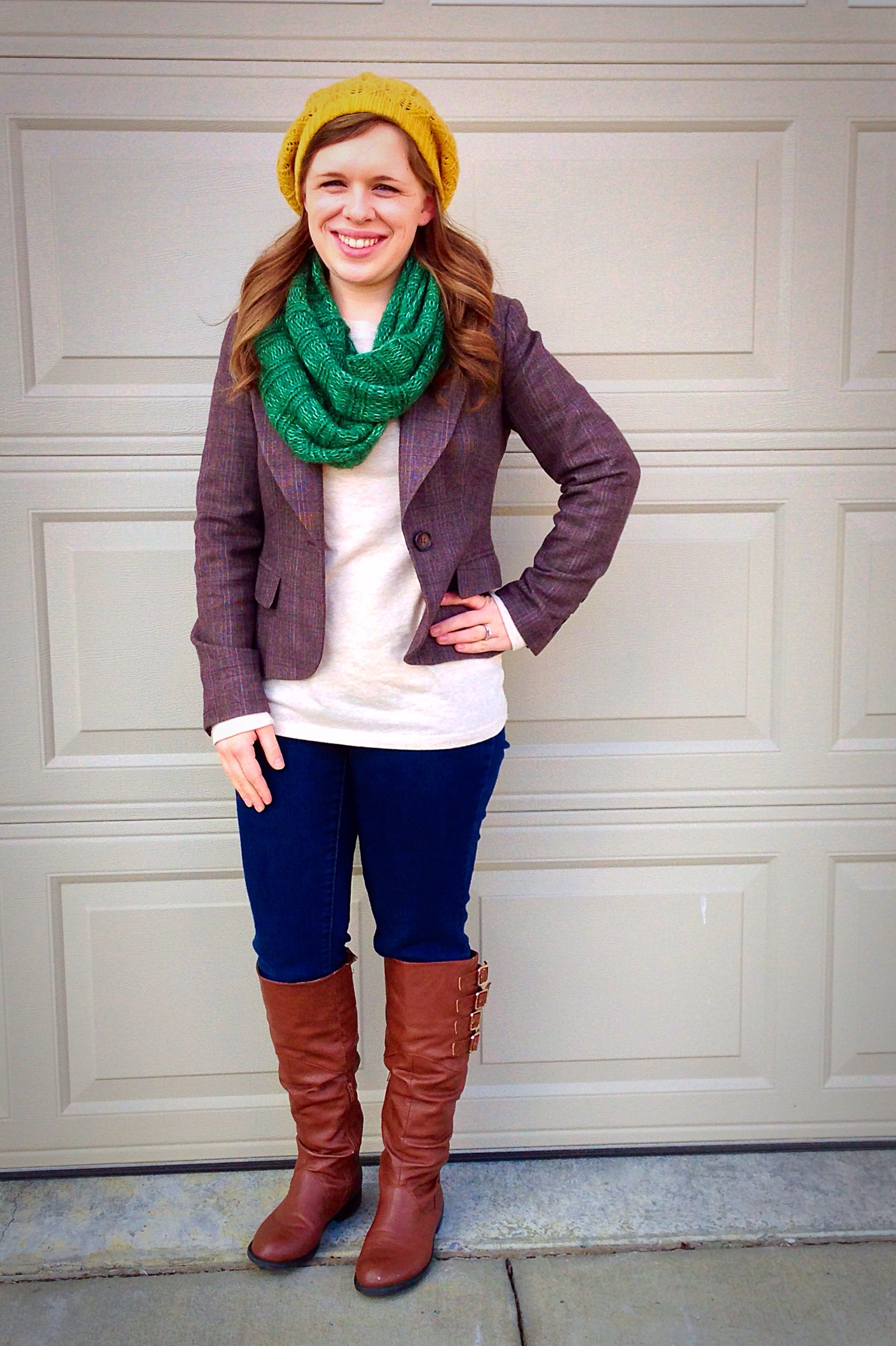 For this outfit I started with the basics of my long-sleeved tee, jeans, and boots and then added a blazer, scarf (another closet fav), and yellow hat for warmth and color.