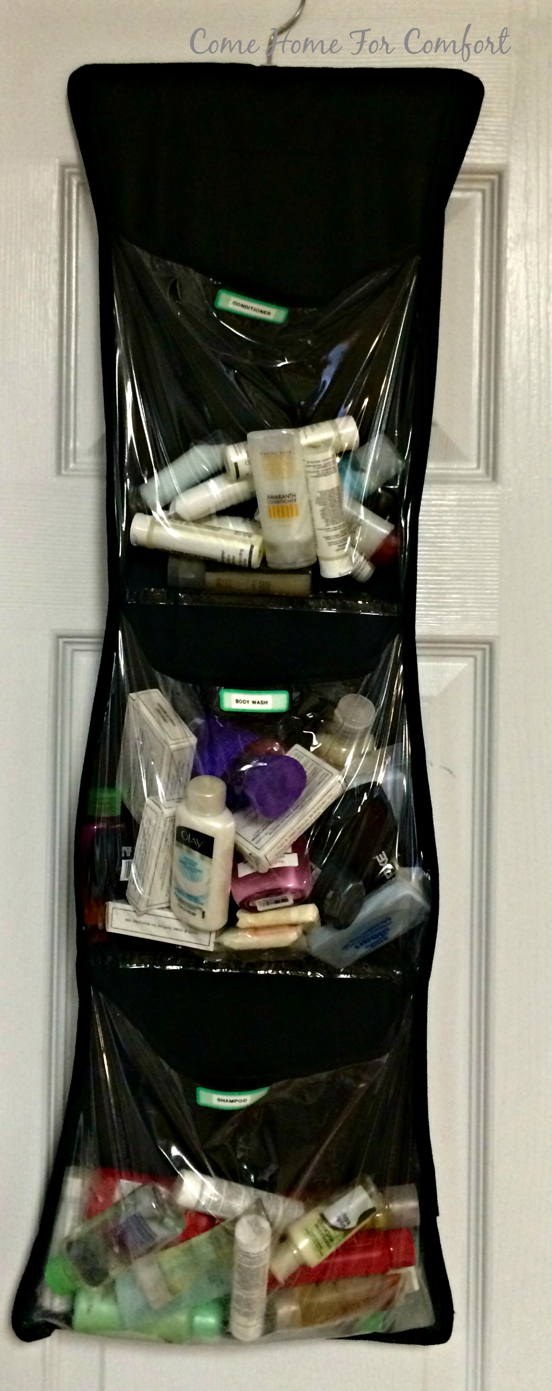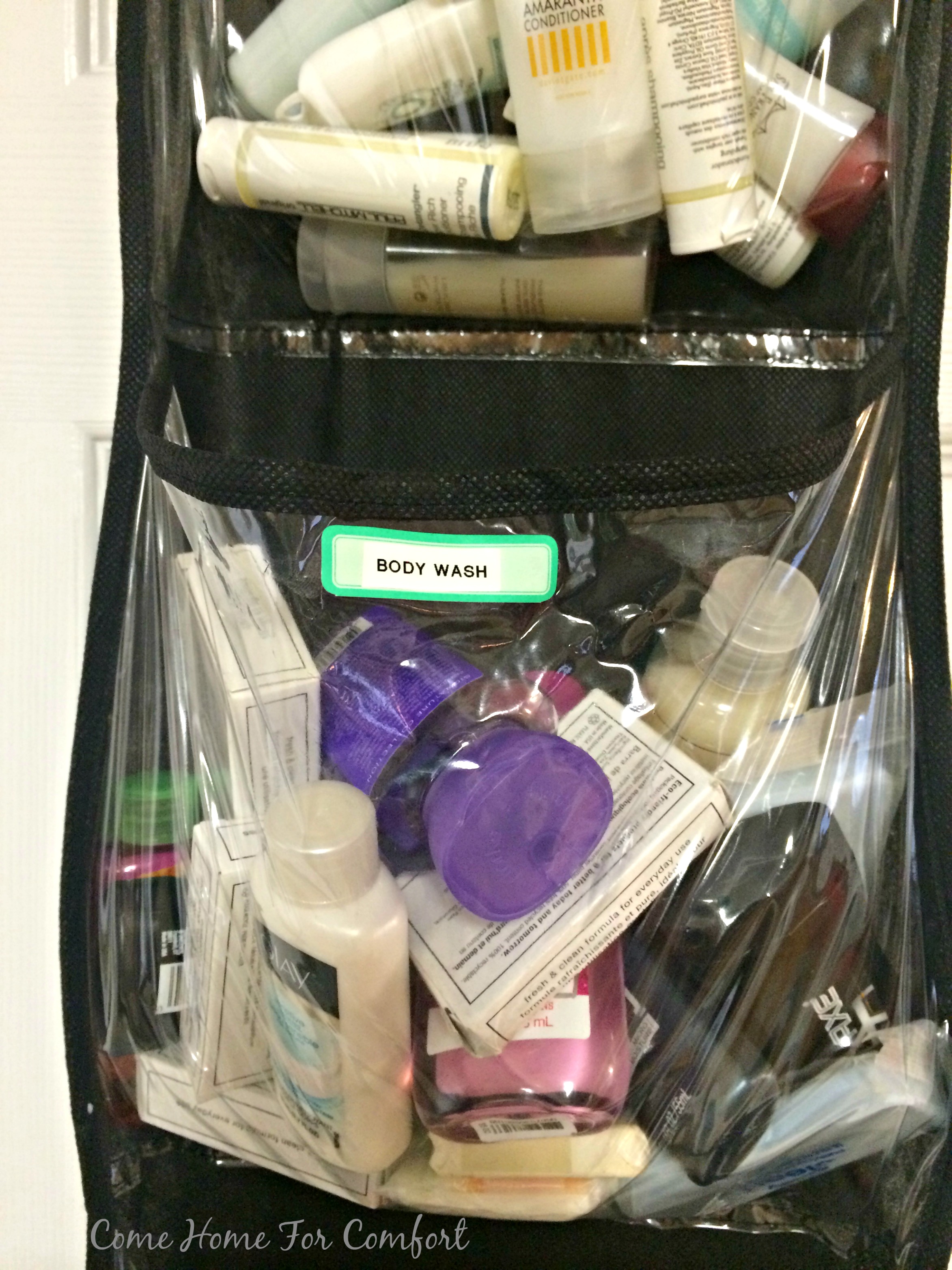 Another update to my system is the over the door organizer that hangs on the inside of the closet door. This contains all our travel toiletries – I have them sorted by shampoo, conditioner and body wash.