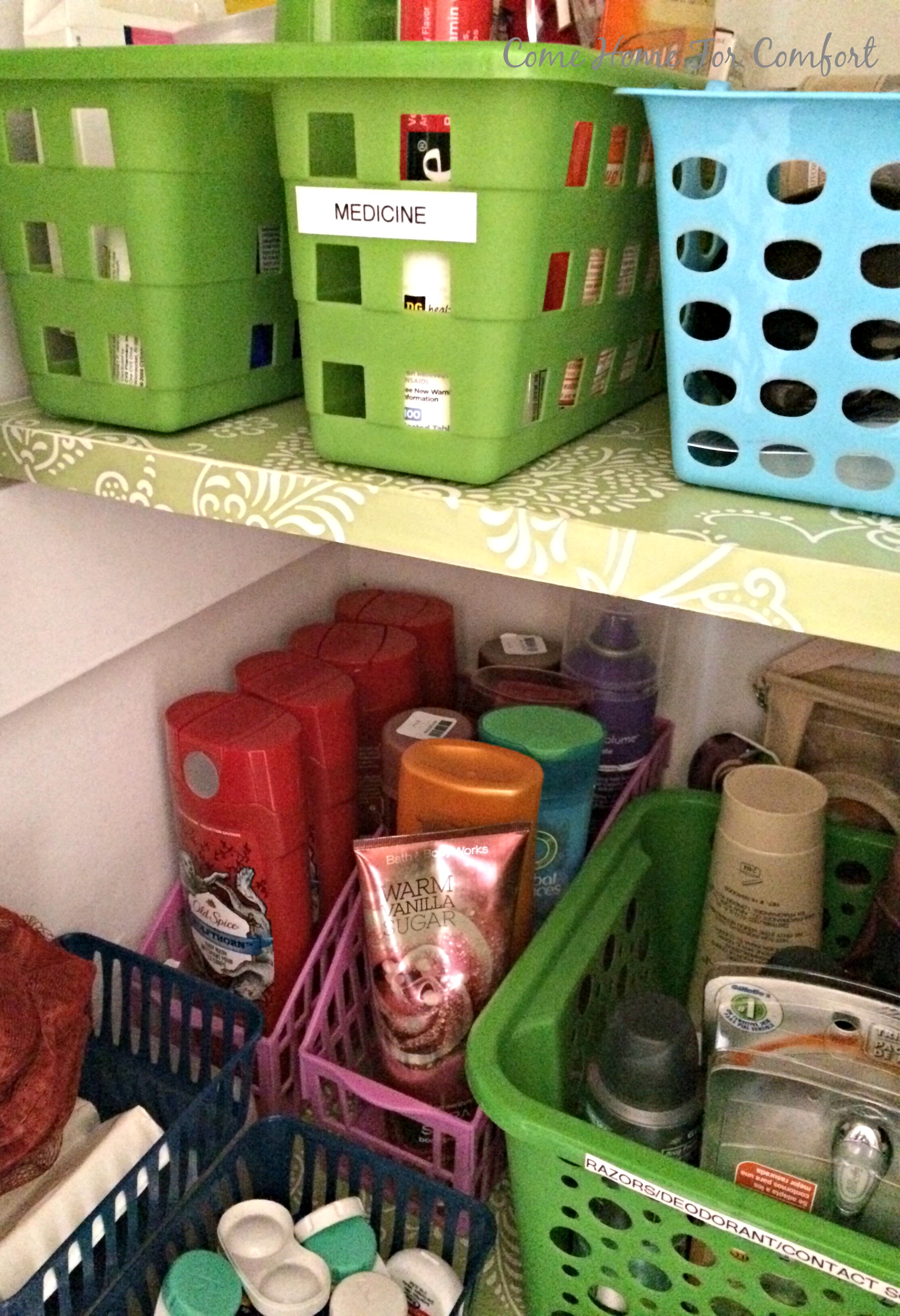 The magazine holder storage is a great idea!!! I hate it when I line up bottles perfectly, only to have them tumble over. I need to keep my eye out for some. Our backup toiletries do need some organization. Thanks for the motivation!