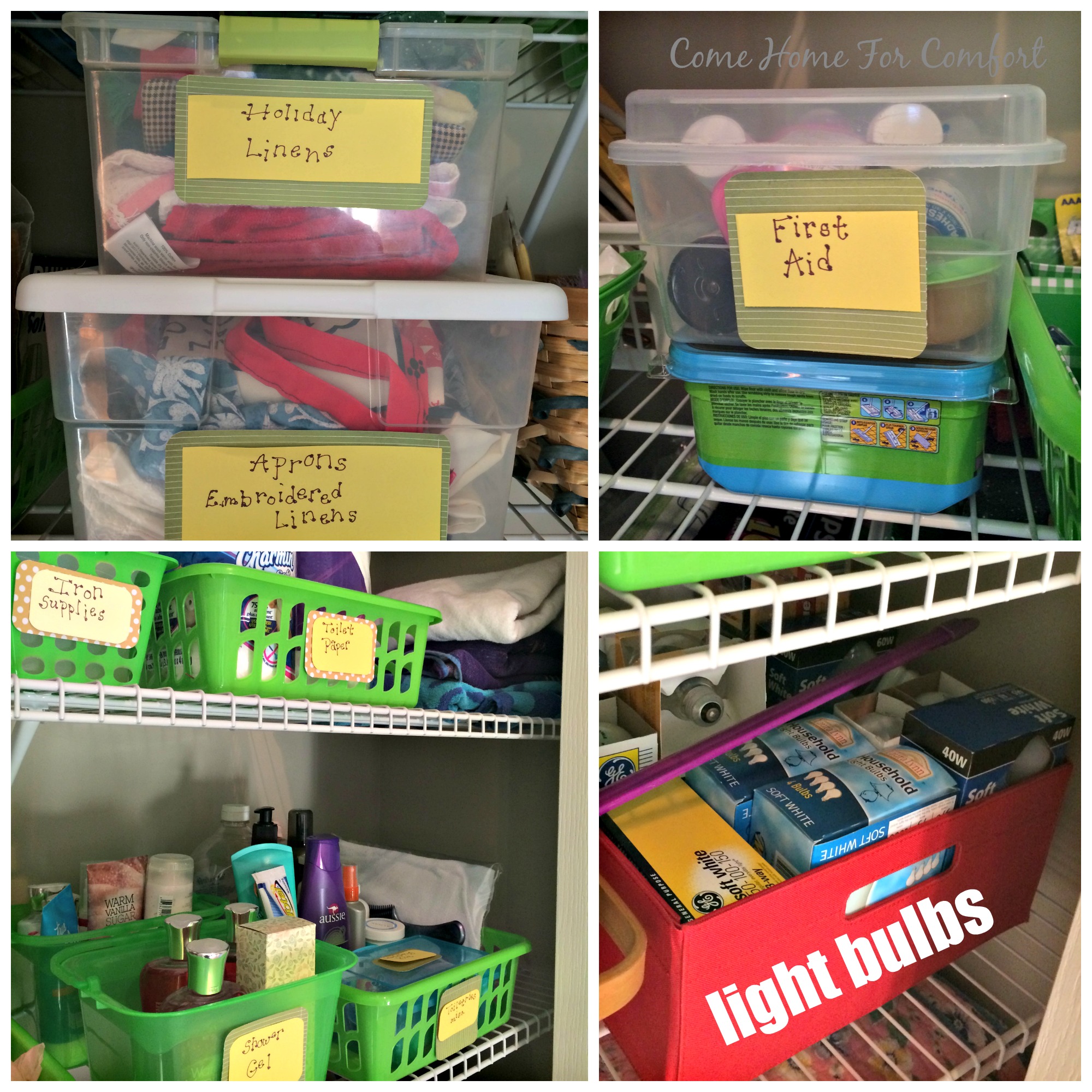 - take everything out of the closet and sort by type (toiletries, cleaning supplies, paper products, etc.)