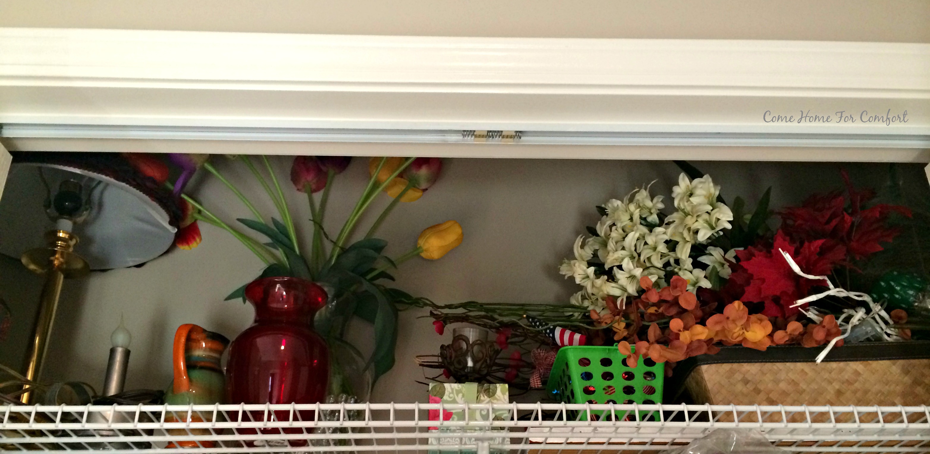 The top shelf is a perfect place to store her extra arrangements and decor pieces. She can easily see what she needs when changing decorations around the house (which, if you know my Mom, happens often). 🙂