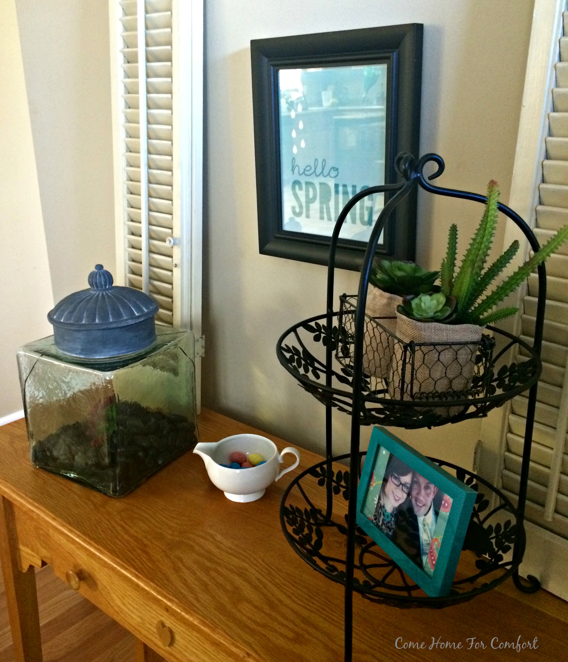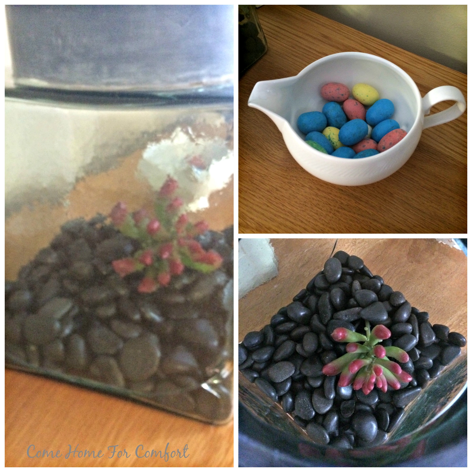 The succulents came from Hobby Lobby, and I found the rocks to fill my glass container at Target. Spring decor is never complete without some Easter candy – those malted milk candy eggs are my favorite (right, Dad?)!