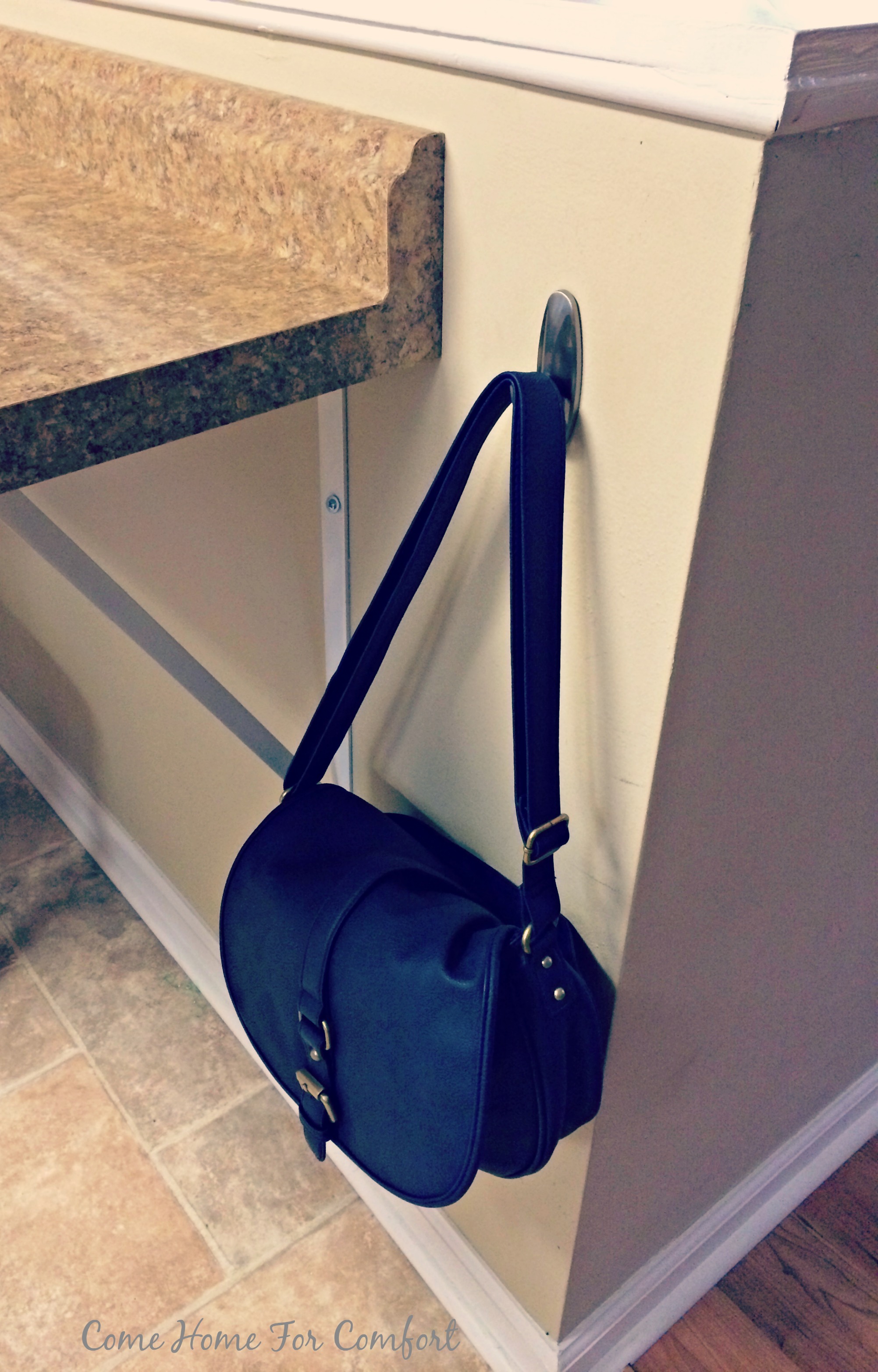 2. Use a hook for your purse. I love having my purse near the door without it sitting on a kitchen chair or (heaven forbid) on the counter.