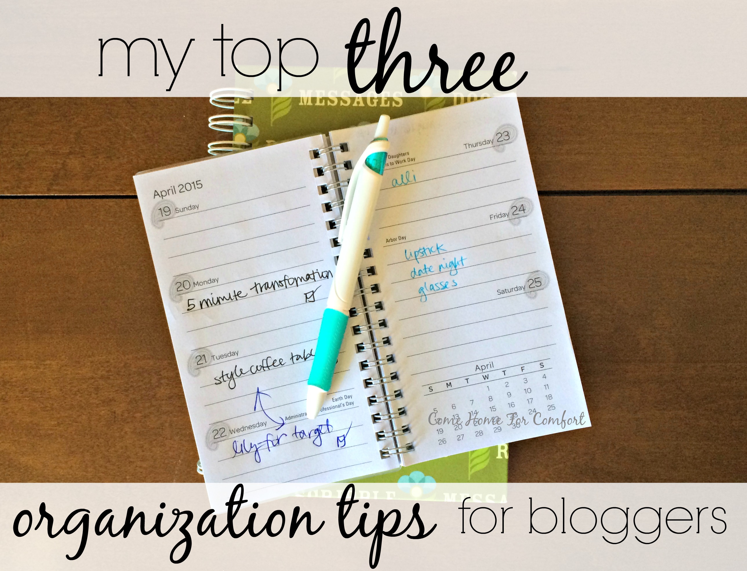 I use an inexpensive week-at-a-glance calendar to plan out the posts for each week. I usually write just the titles or basic concept for the post and then check the box once it’s complete and scheduled. This also helps me to make sure my titles and content are diverse from day to day. I try not to write two posts back to back that are titled “How To…” or that cover the same basic topic like organization or cooking, and seeing the titles for the week in a list helps me with that.