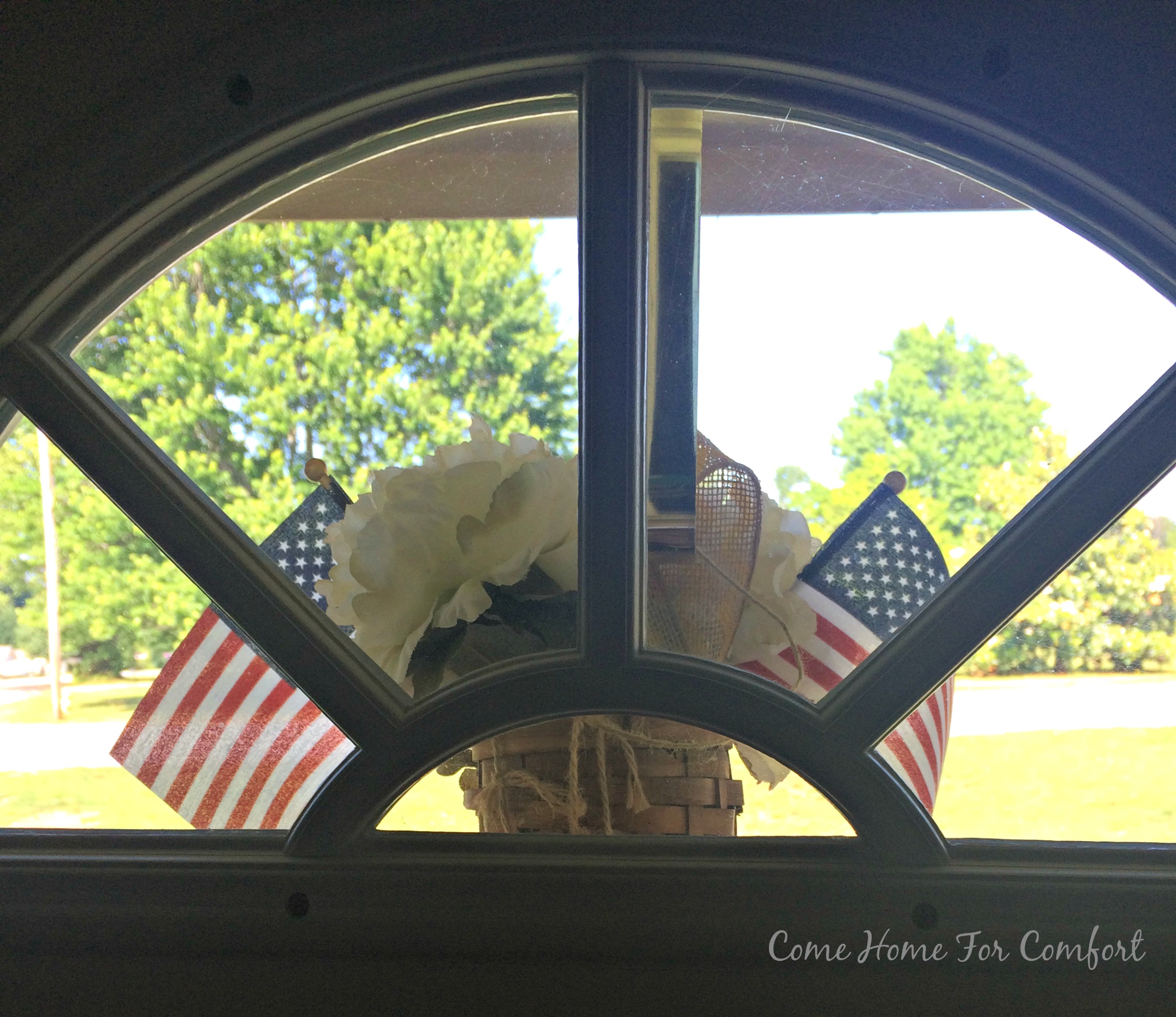 Yeah, this is the same idea I used on my front door at Christmas! I’m not very creative and like to stick with what I have. I found the flags at the grocery store for $.50 each, and they gave me exactly the look I wanted with my silk flowers. My hubby suggested I put something heavy (pebbles or some kind of weight) in the bottom of the basket to keep it from leaning over. He’s so smart! It’s always nice when you can see part of the wreath or decoration from inside the house as well. Here’s the view from my living room!