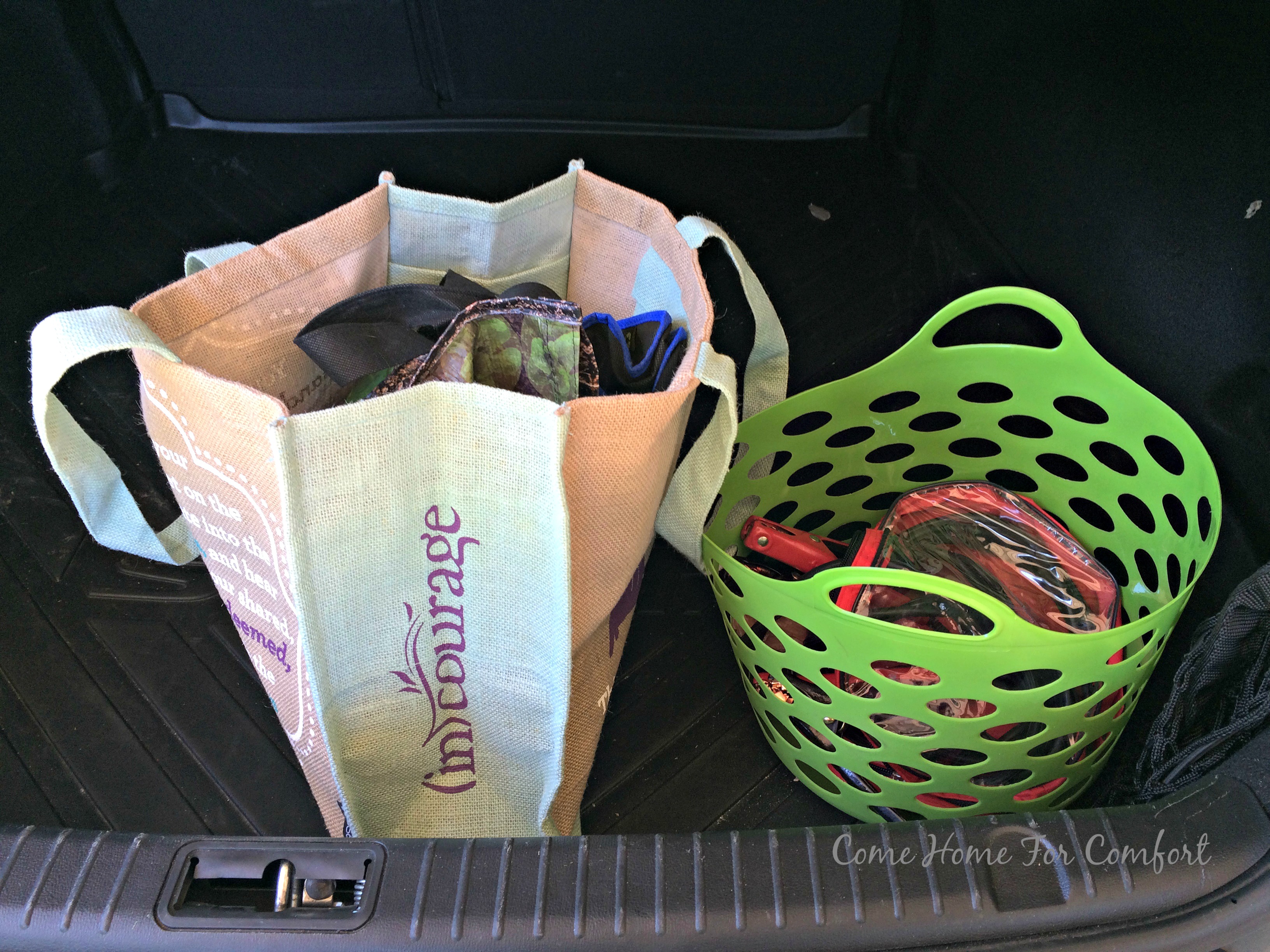 It’s been a while since I shared an organization project with you! This one is very simple but makes life so much easier. Both my hubby and I have recently put organization systems into the trunks of our cars! I was inspired by this post on creating an emergency car kit. I loved how she contained everything in just a few bins. Organizing the trunk of your car isn’t any different than organizing something inside your home – everything needs a place!