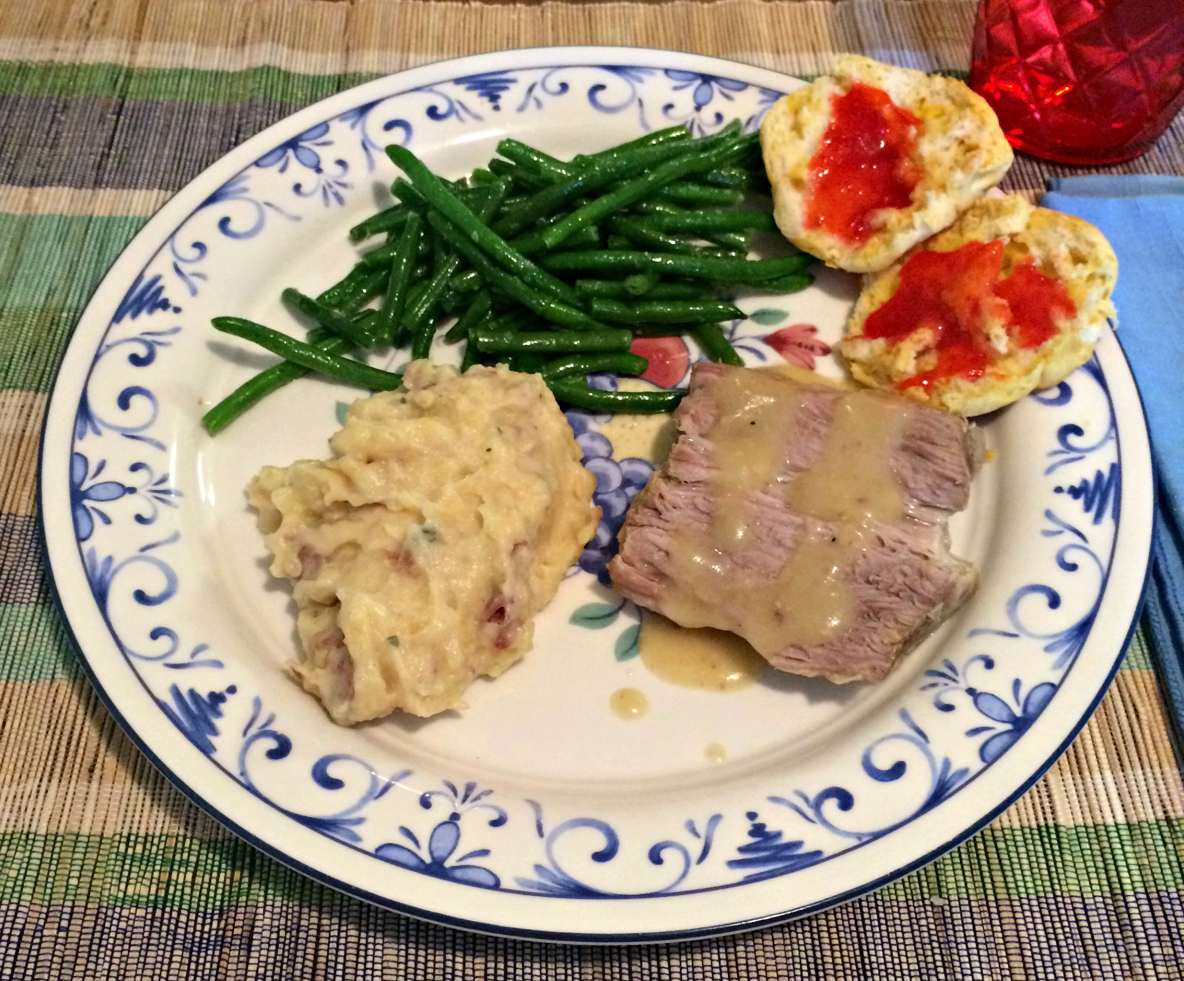 2// I love having extra time on Sunday to fix a nice meal for us. This week I made a pork roast in the oven that turned out so tender and juicy! I mashed Yukon gold potatoes and served them with the gravy from the roast. With garlic green beans and biscuits, it was my favorite kind of supper…and one we eat a lot, apparently. 🙂