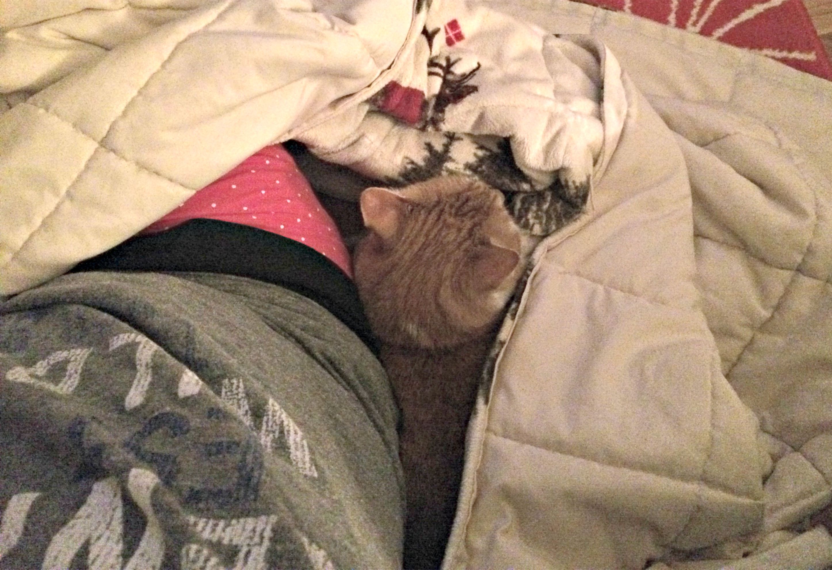 4// Poor Peggy really hates summer storms. She’s normally a lap cat, but when it’s storming she has to get as close to us as well as a large piece of furniture as she possibly can. Here we are Wednesday night, on the living room floor. Peggy wedged herself between me and the couch and ended up completely under the blanket by the end of the evening. Bless her furry heart (but I always like kitty snuggles).