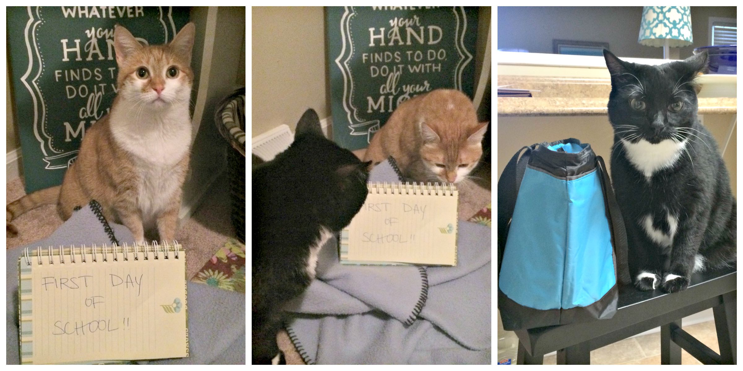 5// Here’s a funny for your Friday. I thought it would be cute to do a mock “back to school” picture with the cats…just because everyone else was posting their children with lunchboxes and cute “first day of school” signs. I wanted to get in on the fun! Turns out, getting cats to pose is a whole lot harder than you think. Haha!