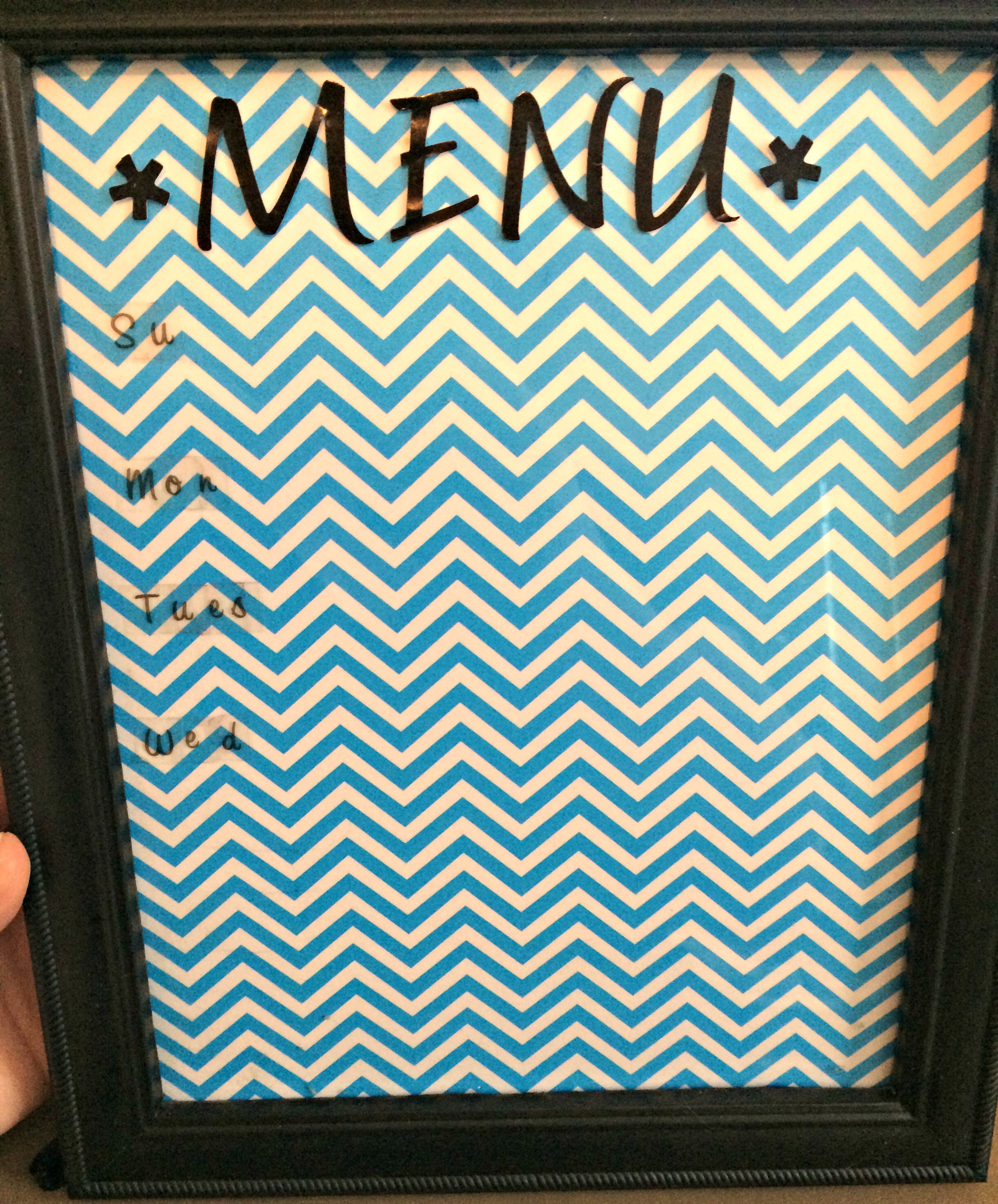 I remembered I had a DIY dry erase menu board that my mom gave me a couple years ago. She put a piece of scrapbooking paper behind the glass of an inexpensive photo frame, labeled the days of the week on the front of the glass and ended up with a cute weekly menu board! She used it for a while and passed it on to me. I enjoyed using it for over a year until I needed the counter space for something else. Here’s what it looked like (I remembered to take a picture after I started removing the days of the week labels, but you get the idea):