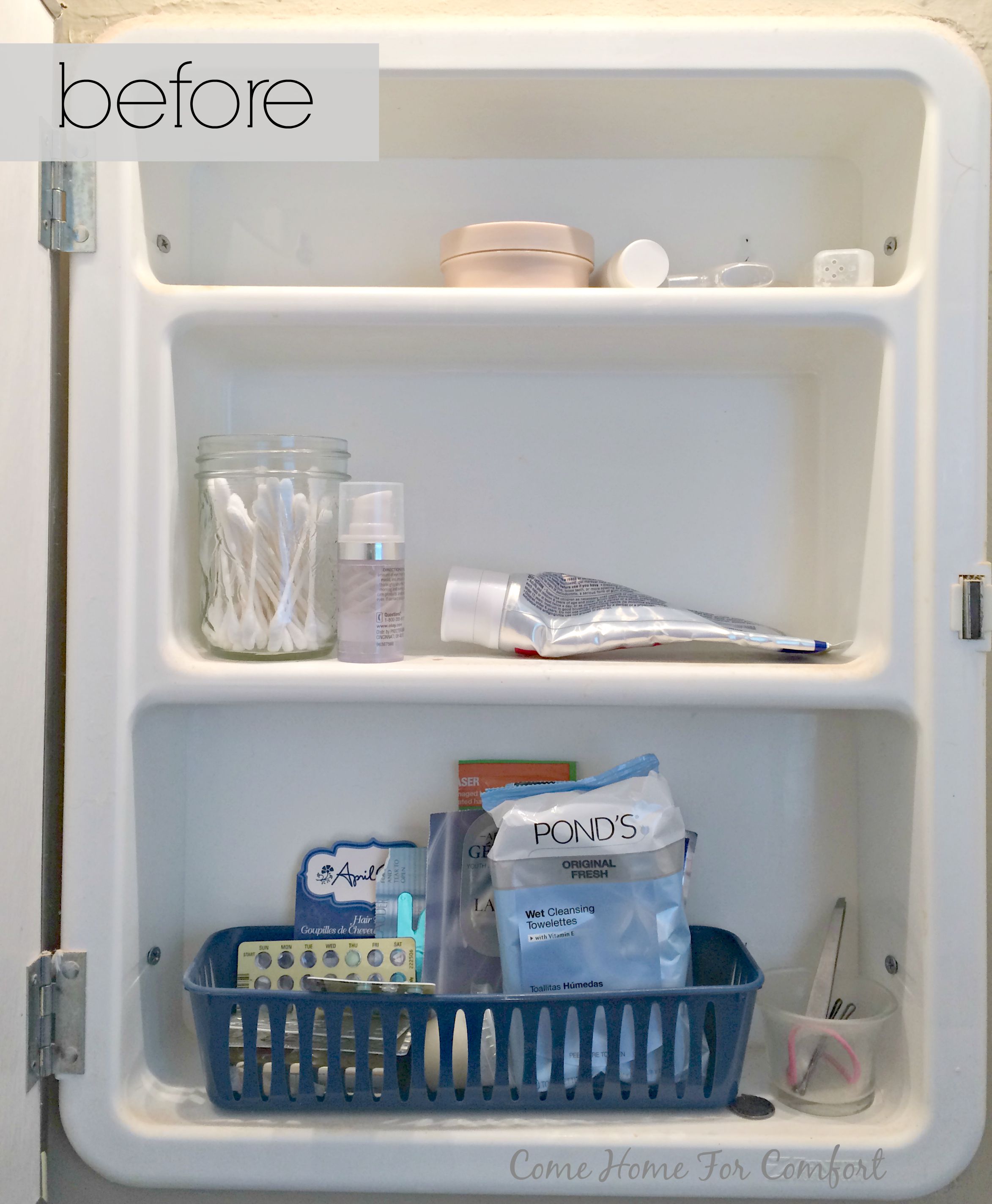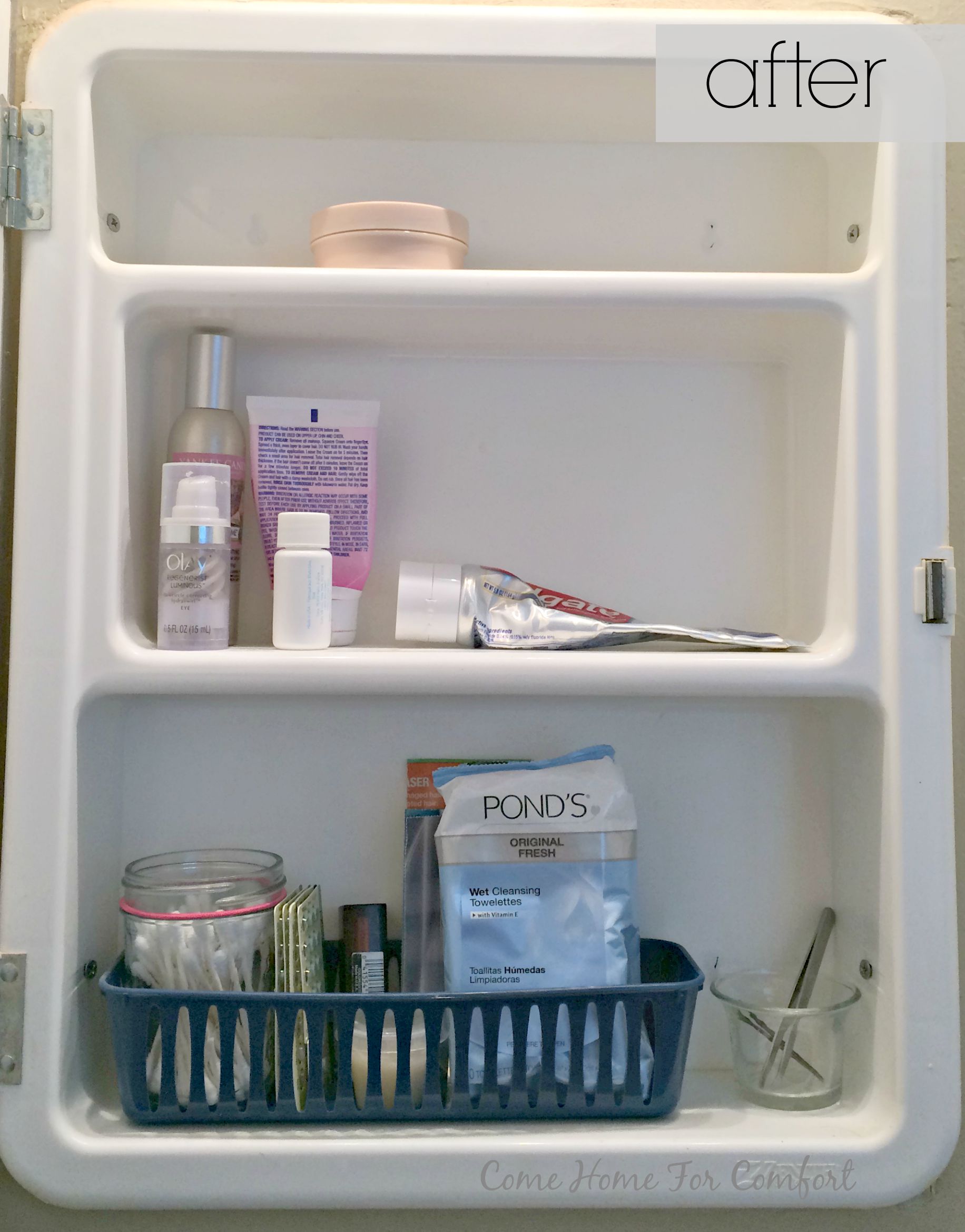 Bathroom cabinets are always tricky to maintain a system in. It seems like you are getting in and out of them every single day and so you have to put daily stuff towards the front or easily accessible. I try to put the stuff that I don’t use as often in the back, but I find myself having to constantly be tweeking my system. Good work on your problem area. Those mini baskets really help keep my bathroom drawers and shelves in order. It’s also nice you didn’t have to buy anything new to fix your bathroom situation. Way to go!