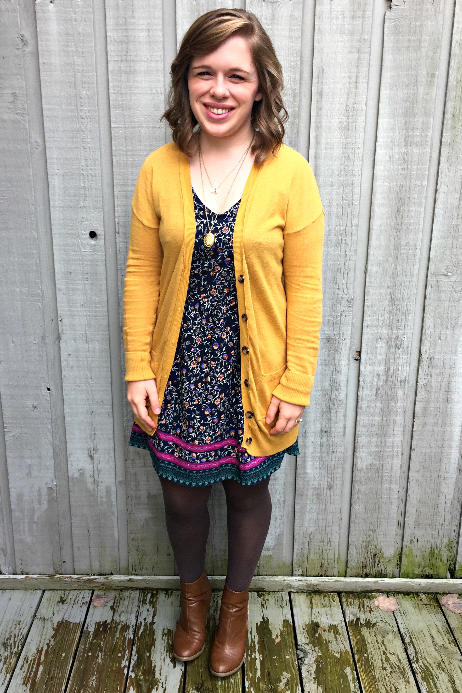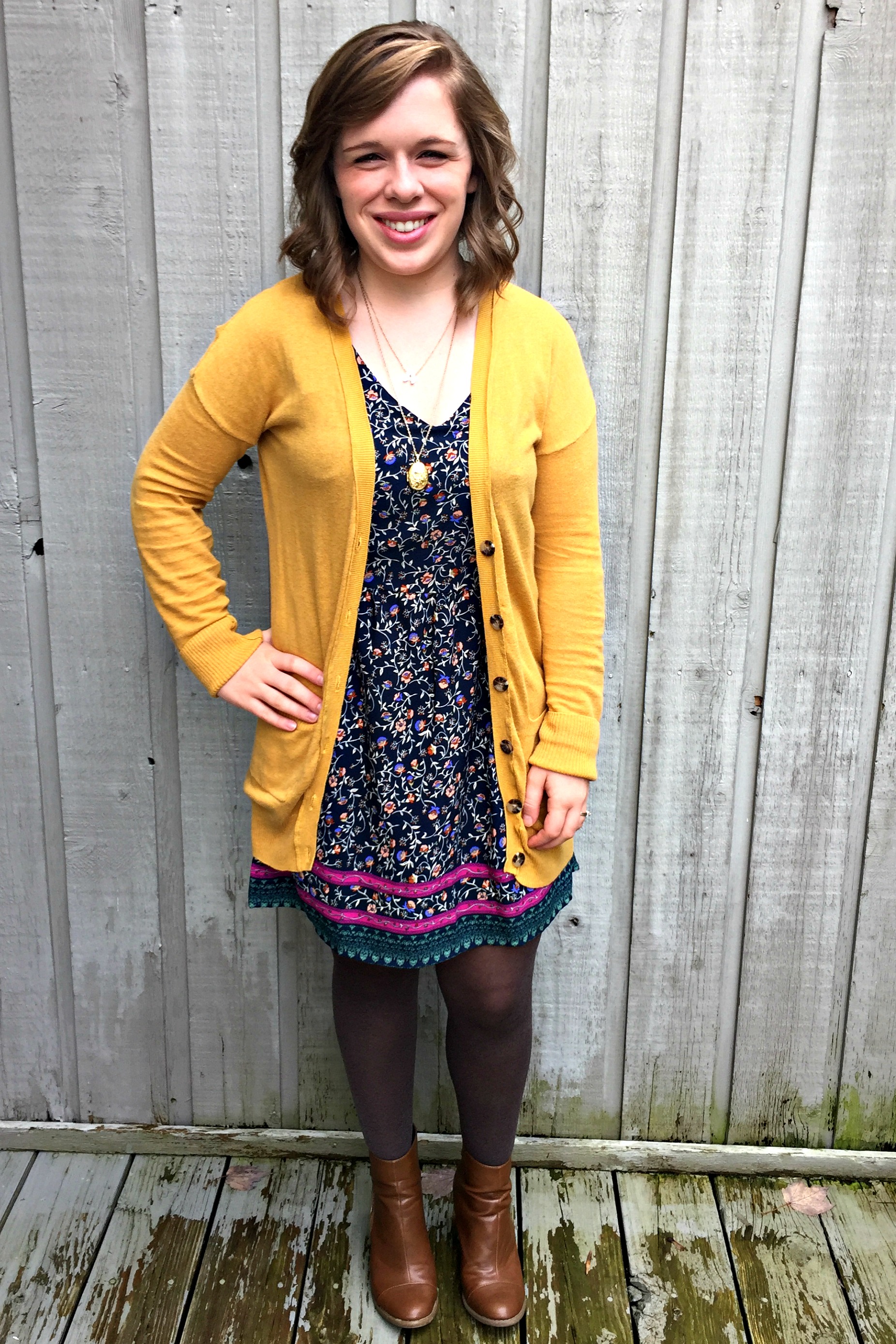 Dress:TJ Maxx / Cardigan:Target / Booties: Beaty’s Shoes / Tights:Old Navy / Necklace:Charming Charlie