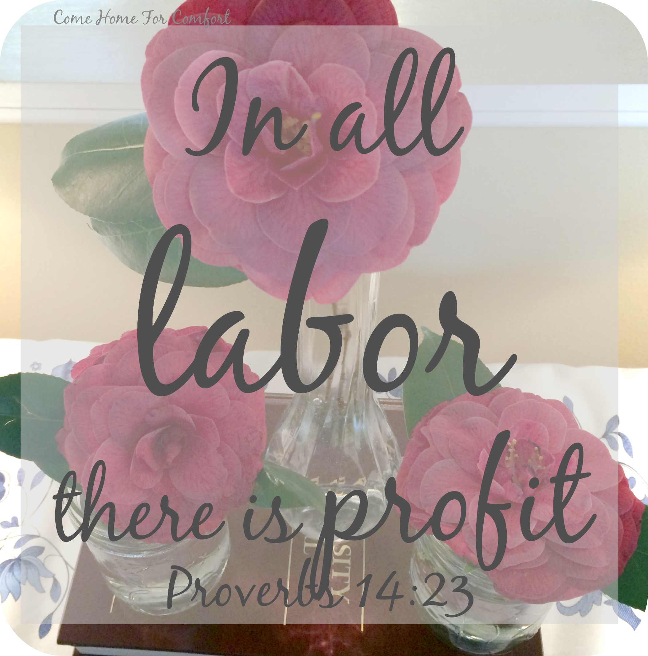 I think that most of you are the kind of people who stay on top of your household tasks, even the ones you don’t like to do. If you’re one of those people and you have begun to feel like your labor is in vain, be encouraged! Even if the floor you mopped gets dirty two seconds later (that totally happens to me!), don’t give up. It’s tempting to say, “I don’t know why I even do ____ anymore!” Remember the promise of God’s Word that all your labor has profit and look for the camellia bush on the other side of the litter box. 🙂