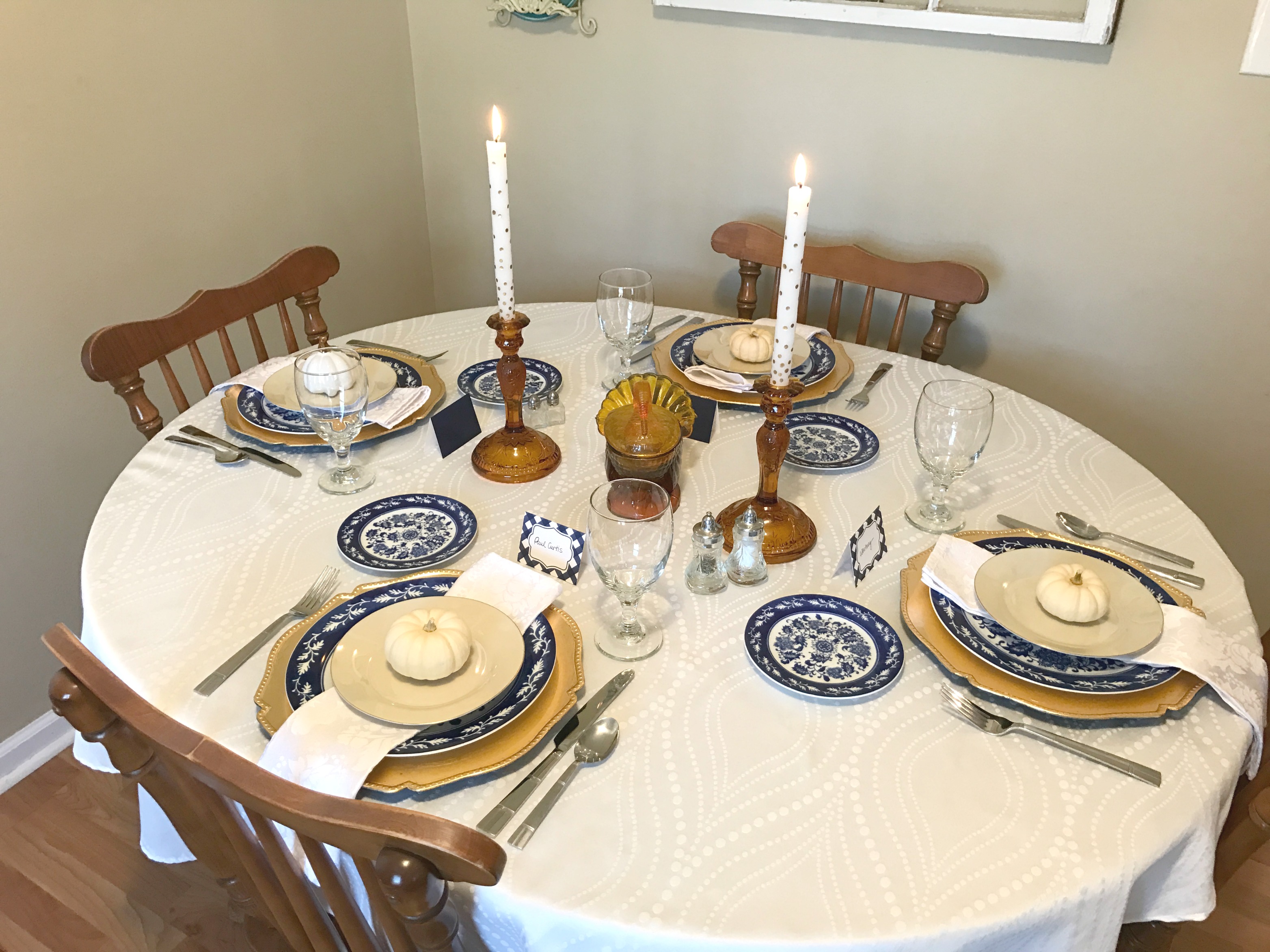 I am in full Thanksgiving mode! As I mentioned in my Thanksgiving planning posts, I always give my table settings a practice run before a big party or holiday. I’m not naturally creative, but I enjoy gathering inspiration and trying to make my tables look beautiful! This year I wanted to use a new set of blue and white dishes my mom gave me. I combined that with an instagram picture I saw during Canadian Thanksgiving and arrived at what I think is an elegant twist on a traditional Thanksgiving table!