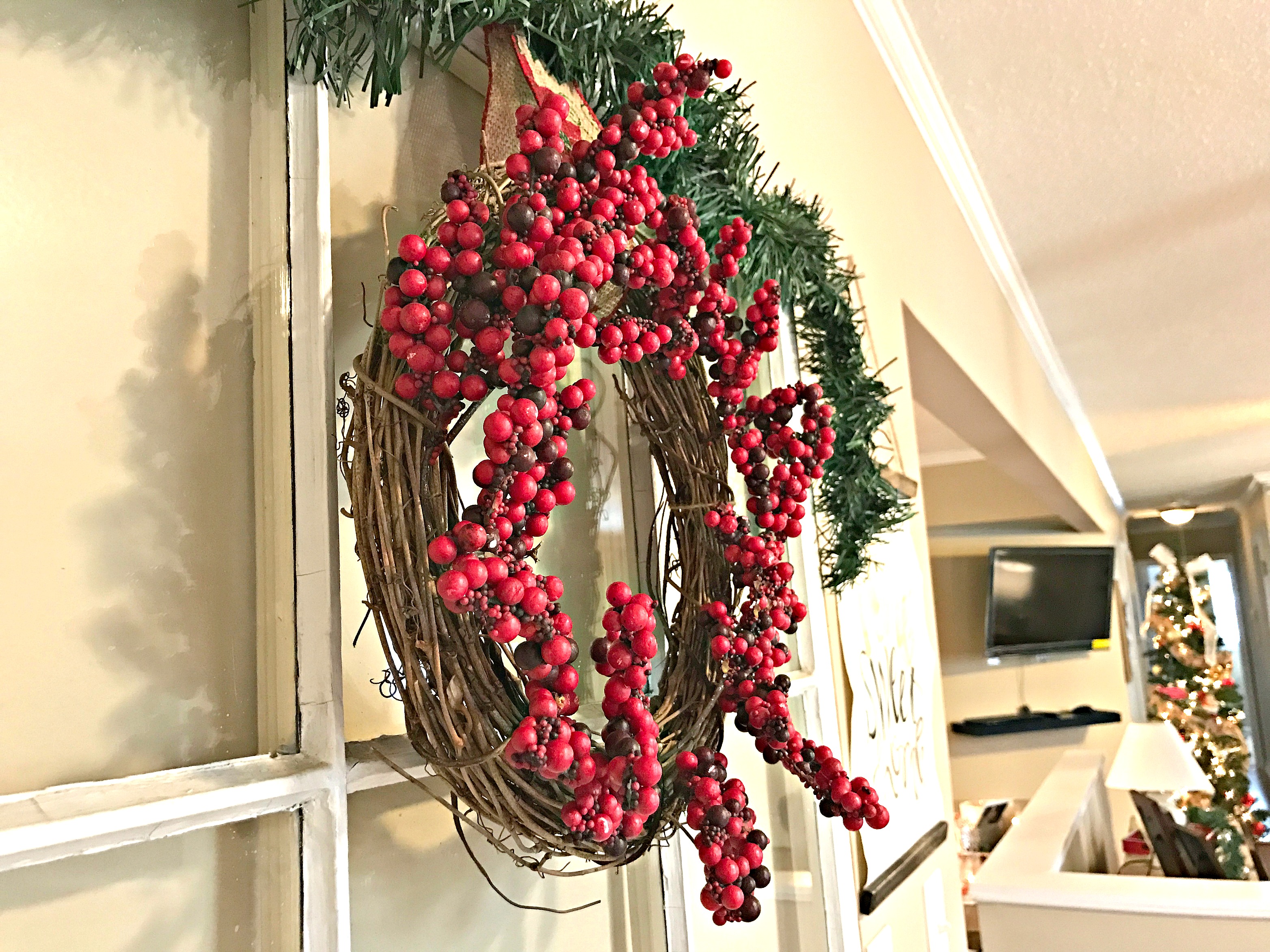 My outdoor decorations are exactly the same as last year – I have my $5 Goodwill Challenge project on the front door and my simple berry wreath on the side door!