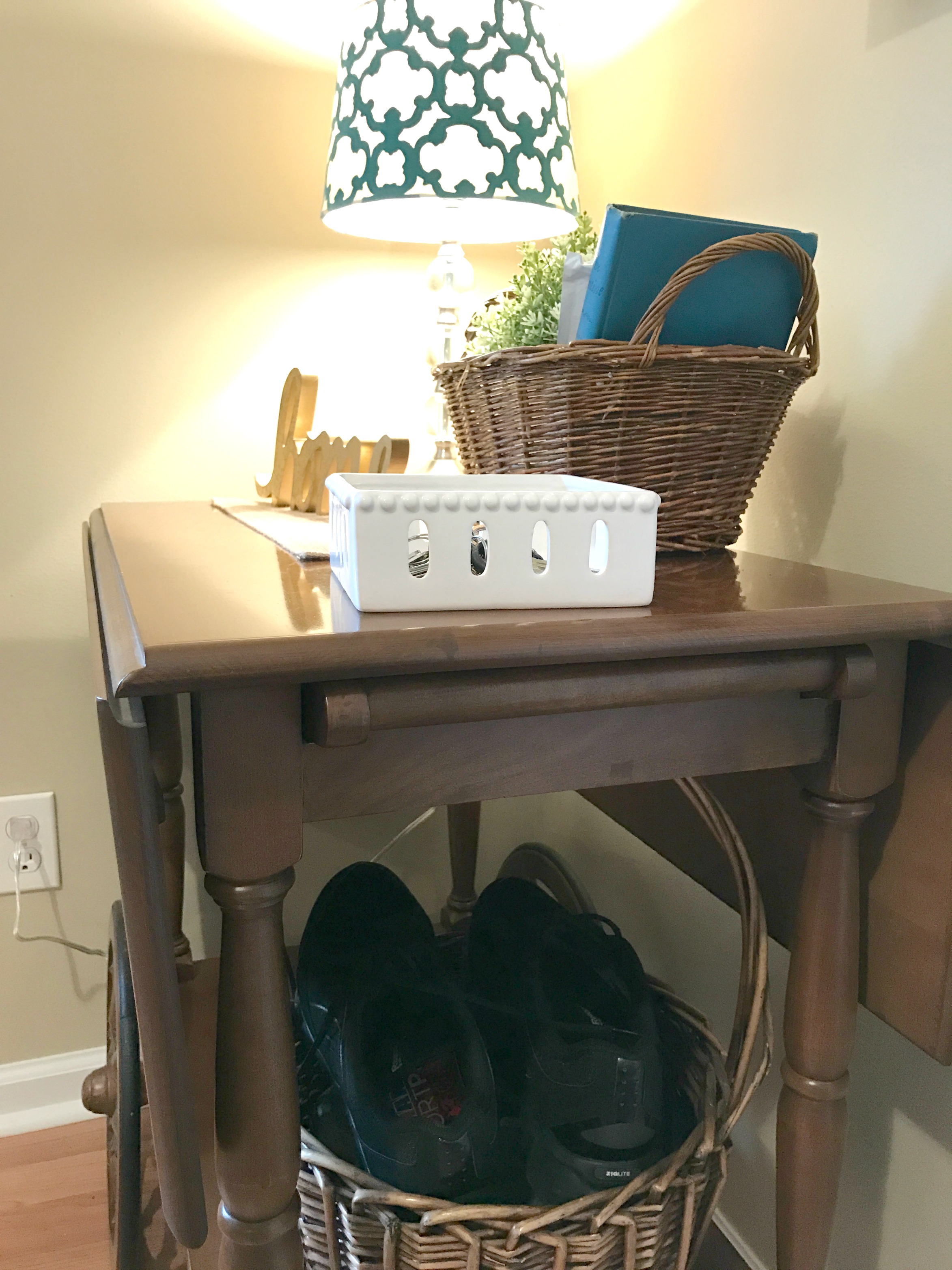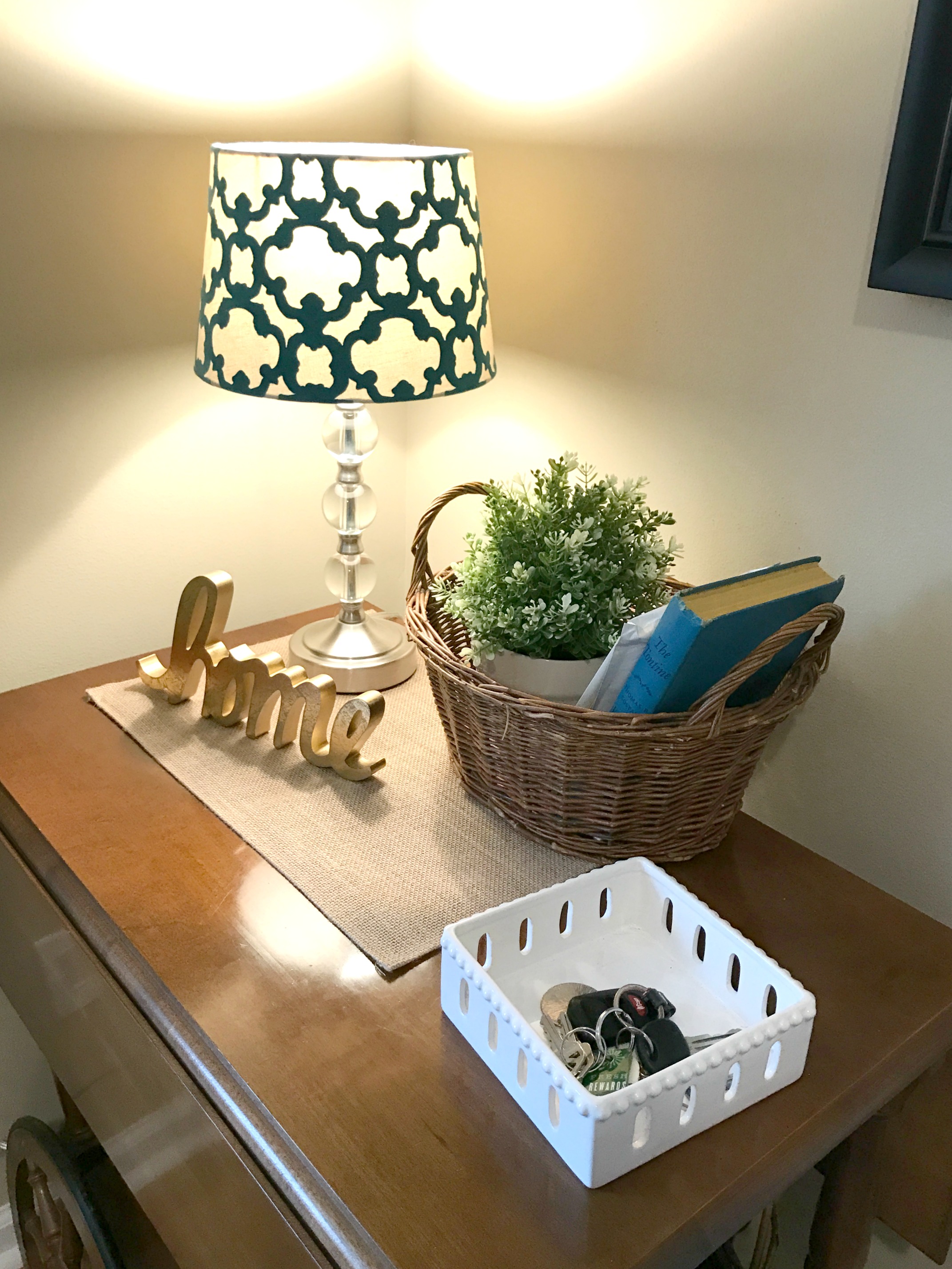 My home is always a work in progress. As my tastes change, the colors and decor in the house usually change with it. As our needs and daily schedules change, the functionality of our home should also change with it. I’ve always had a drop zone type station by our door for keys and shoes, but I noticed that it wasn’t working as well as I would like. Before I made any changes, I thought about what I wanted this space to accomplish:
