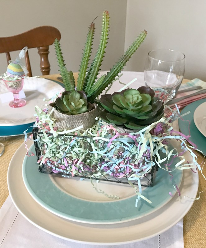 1. I love it! Love the colors, the paper Easter grass and that your centerpiece has succulents in it. Your advise of layering is perfect and I love how you worked some pastel plaid into your tablescape. Great job.