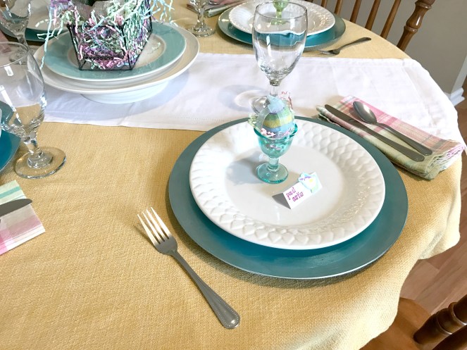 1. Use what you have. In this instance, nothing on the table is new, and only a few elements are specific to Easter. My yellow tablecloth, turquoise chargers, white plates, goblets and the white cake stand have all served me for other holidays as well!