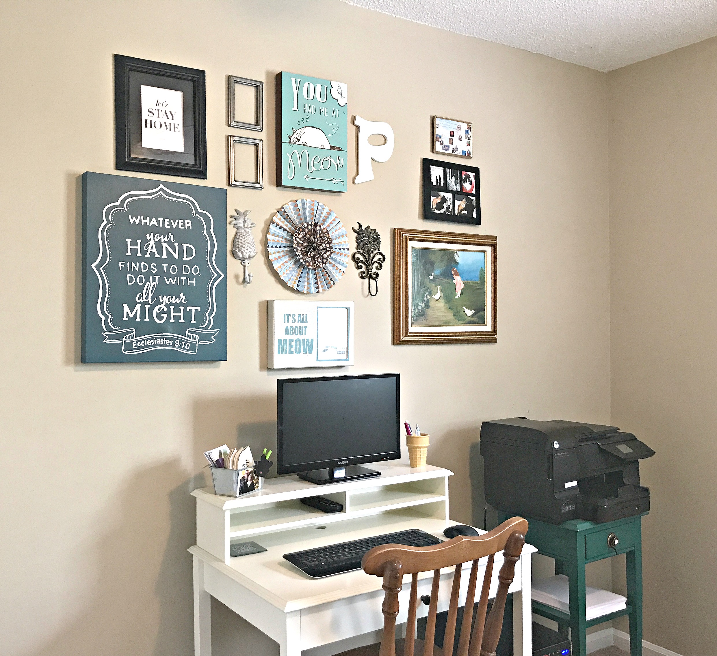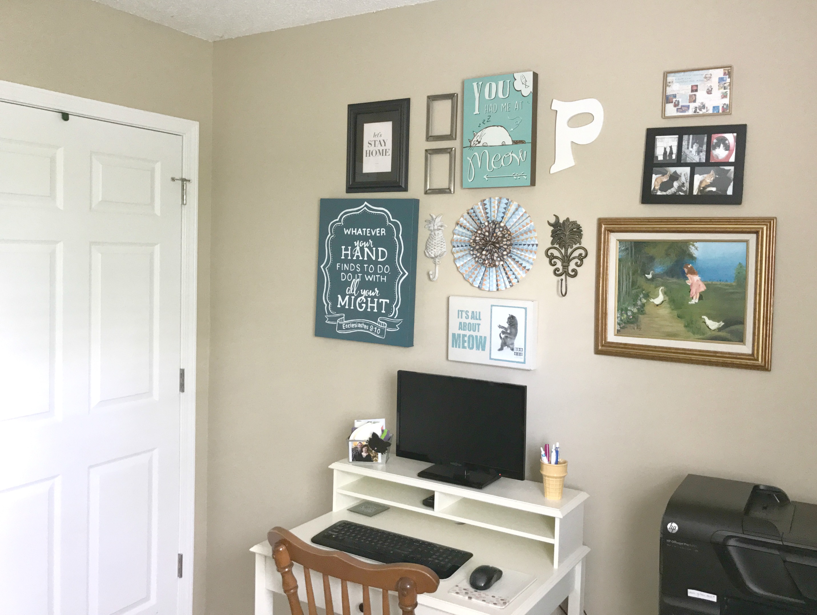 I am so excited to share my new gallery wall with you today! Over the last couple of weeks I set aside some time to finally decorate my home office. I’ve been using this room as my office for about three years, but gave priority to the other rooms in my home with decorating energy and expense. This spring I found the perfect desk and a coordinating book shelf, and that was all I needed to get things moving!