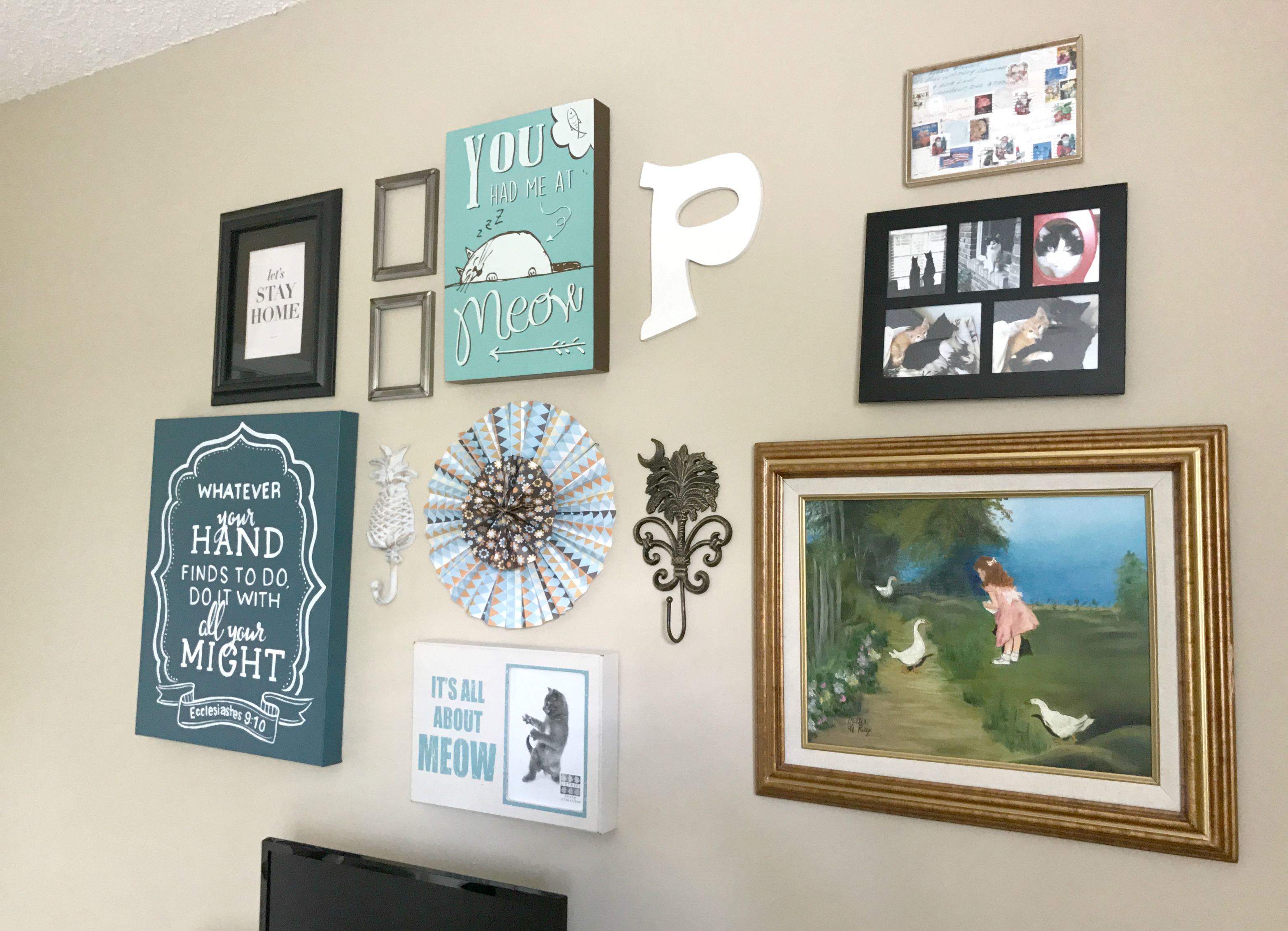 - Lay all the gallery wall pieces out on the floor and arrange them the way you want