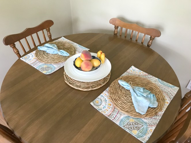 These woven chargers were a different story. I had them styled on my kitchen table before I even removed the tags! My mom purchased a few of the same ones several weeks earlier and I loved how she styled them on her kitchen table. I couldn’t wait to use them in my dining area!