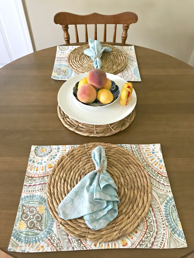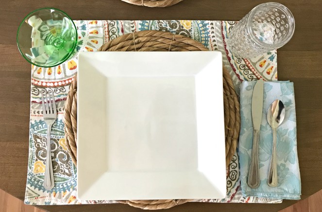 Setting a pretty table doesn’t have to be complicated or expensive! I picked up those place mats from a Target clearance a couple years ago, and everything else I’ve had for ages! In between meals, I leave the centerpiece on the table along with the place mats, chargers and napkins.