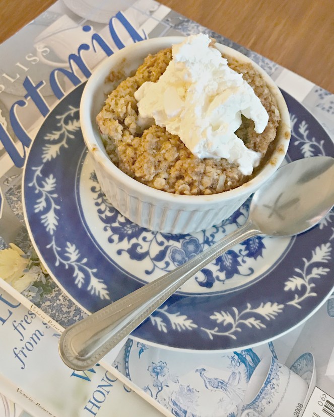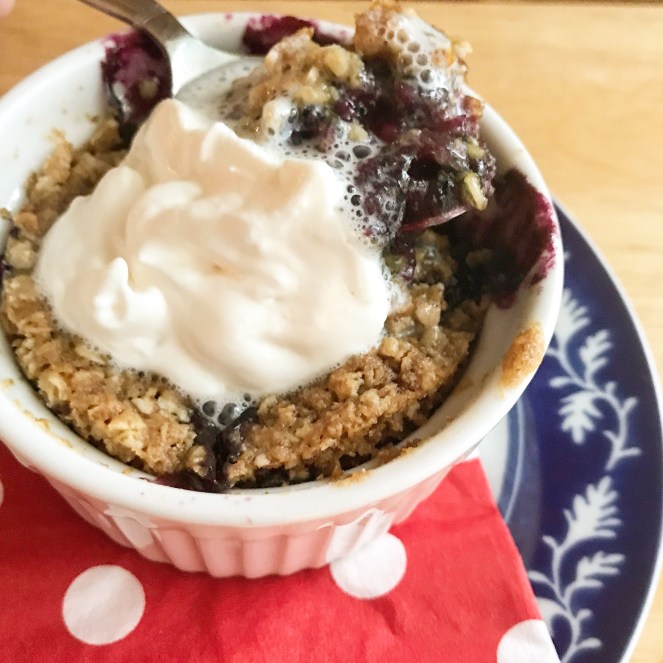 My Mom posted this recipe on her blog and I couldn’t wait to try it! I love cobbler, but Paul won’t touch it. There’s no reason for me to make a big pan of any dessert just for myself, so I literally haven’t made cobbler in seven years! This recipe changed my life. Now I can have just enough cobbler any time I want! I’ve made this recipe with blueberries and peaches, and both are equally delicious!