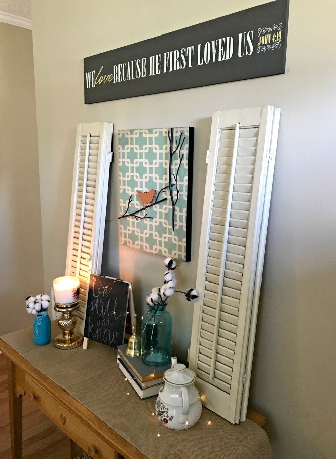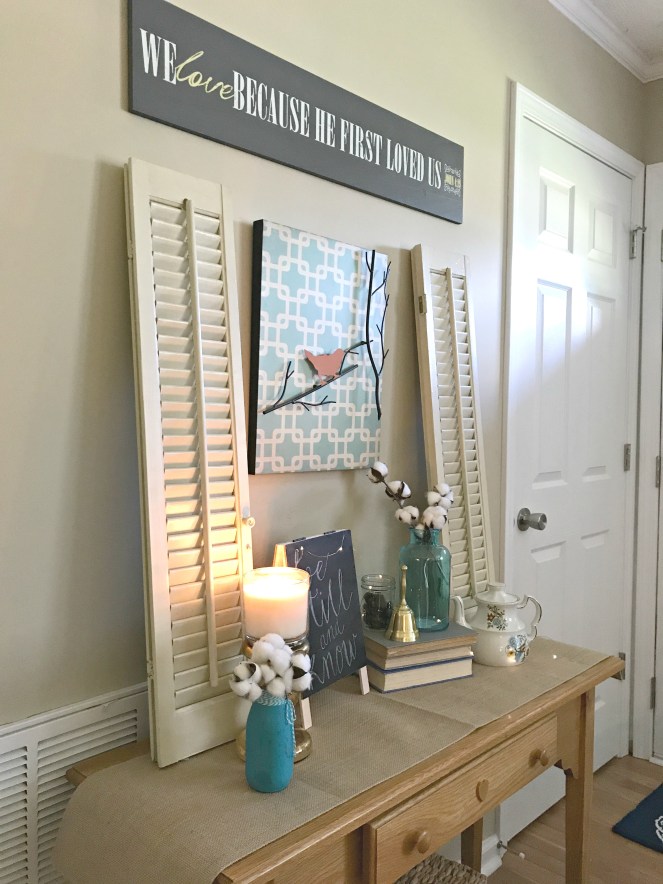 I took the light linen runner off the entry table and replaced it with a burlap runner, exchanged the summery florals for some cotton stems and added gold and brass accents to warm it up. Twinkle lights and candles are always part of my decor, but they are even more cozy for fall!