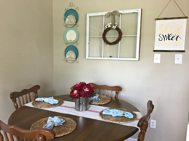 I love the black and white buffalo trend and tried to make it work in my home, but it just didn’t flow. I compromised with the tan and teal print! 🙂