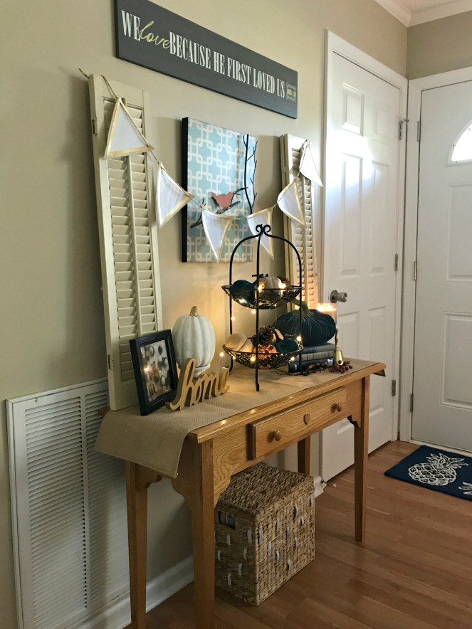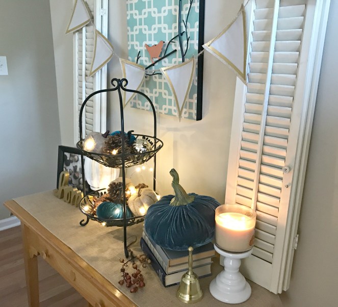Happy Birthday!! Love how everything turned out for Fall. I love your mix of metallics, blues and twinkle lights. Looks warm and cozy. Now lets just hope those temps cool down to match the season soon.